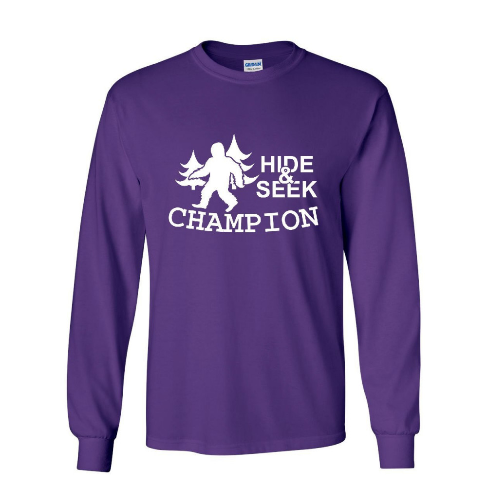 HIDE AND SEEK CHAMPION long sleeve t-shirt bigfoot yeti funny humor tee purple