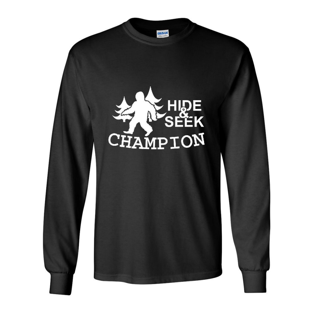 HIDE AND SEEK CHAMPION long sleeve t-shirt bigfoot yeti funny humor tee black