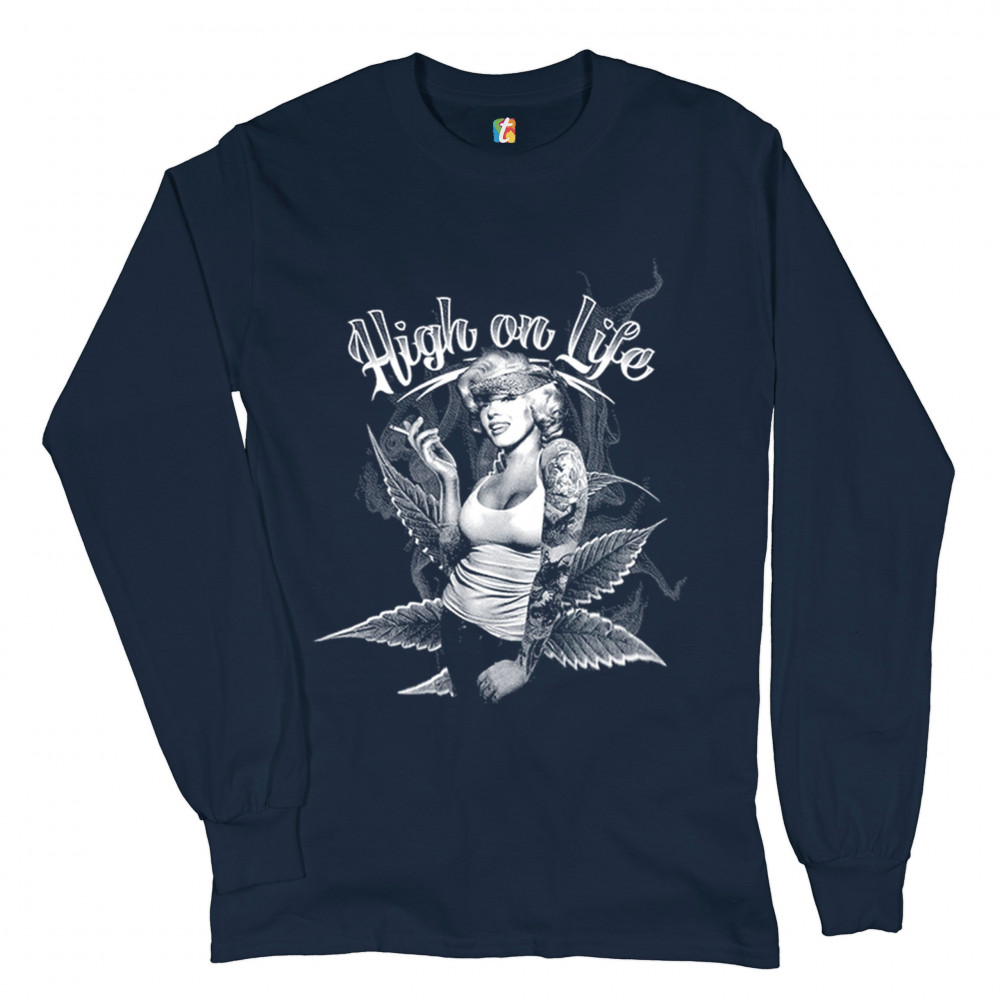 HIGH ON LIFE long sleeve t-shirt marilyn monroe holding a joint 420 pop culture navy blue