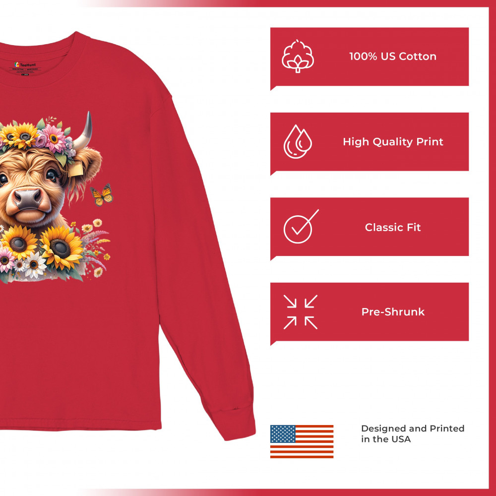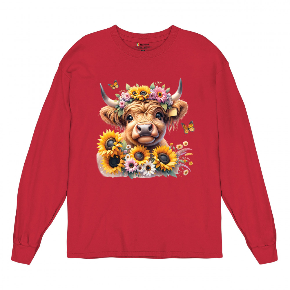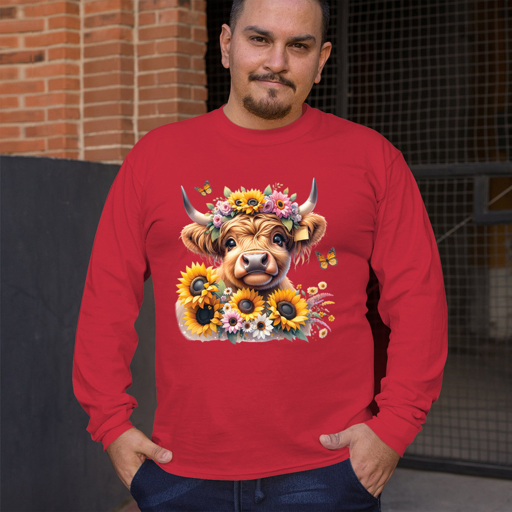 Highland Cow floral design with sunflowers and daisies, rustic farmhouse cow style, western ranch boho charm, and cozy country farmhouse shirt vibes.