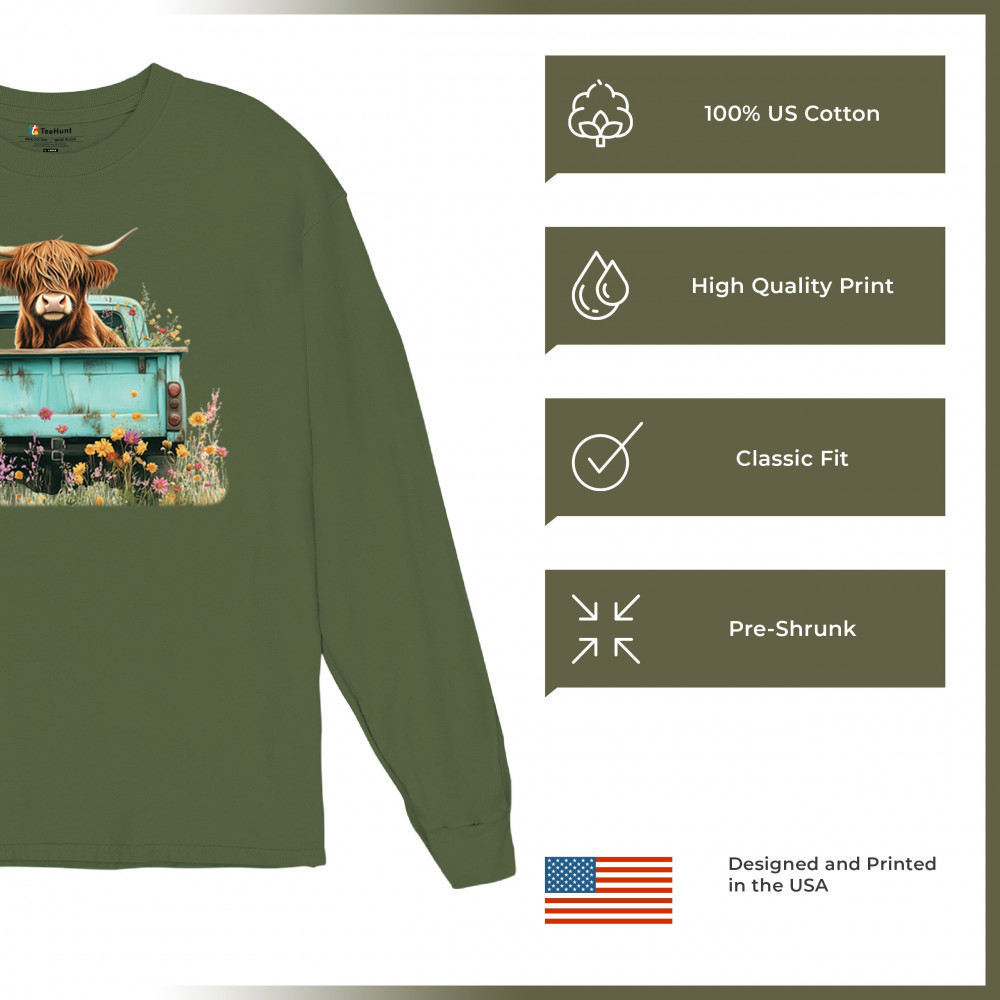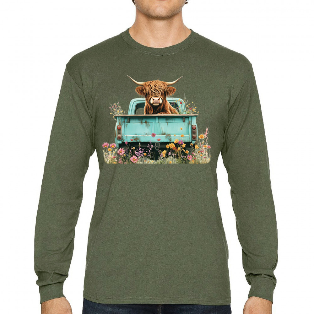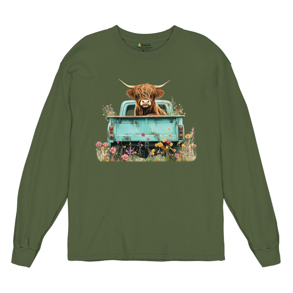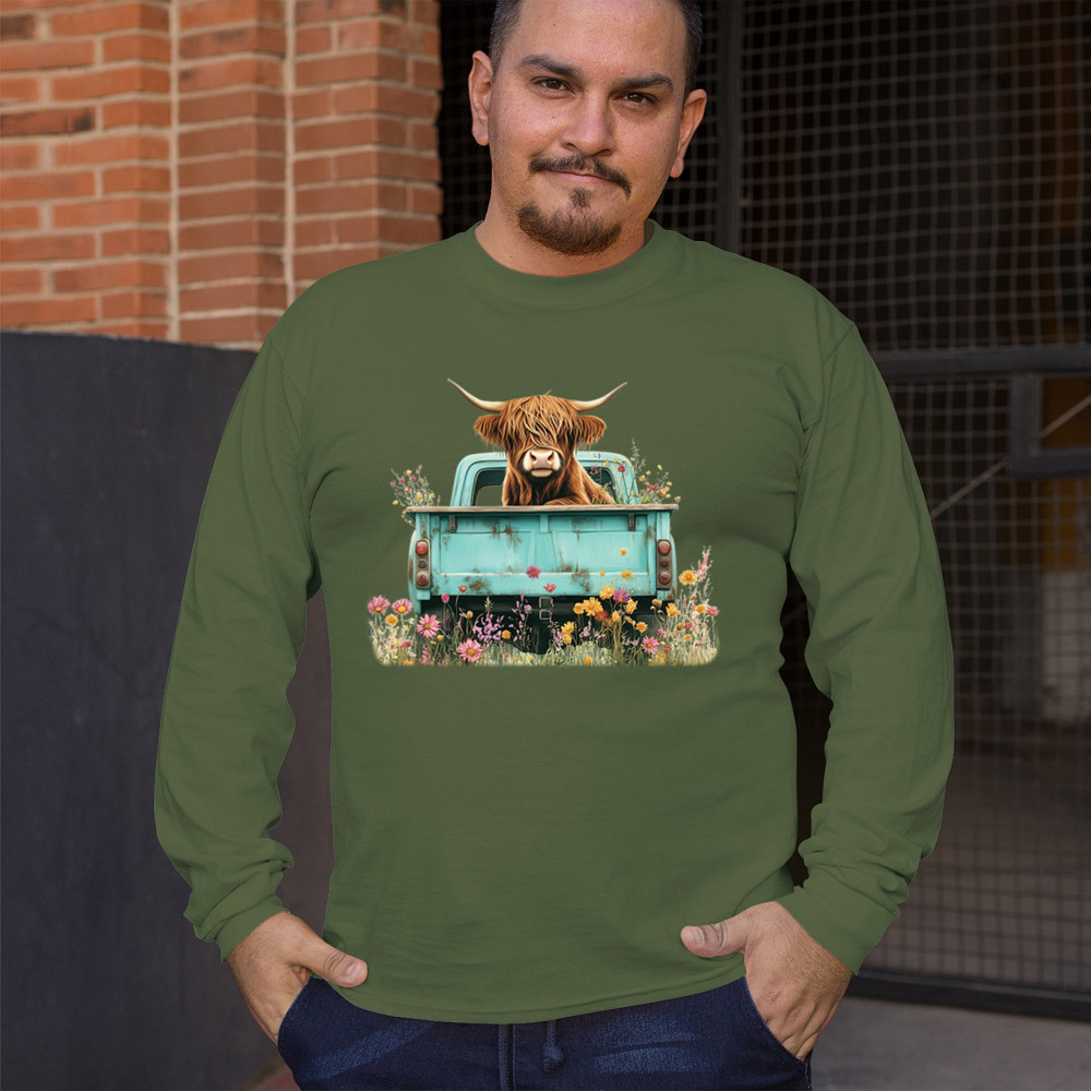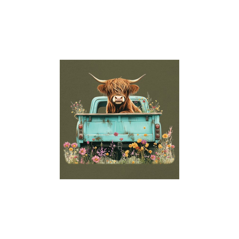Celebrate rustic charm with this Highland Cow truck design, combining farmhouse floral truck art, boho ranch vibes, and country farmhouse shirt appeal. Perfect for cow lovers, barn style enthusiasts, and small town rural living. A vintage truck cow design that’s both cozy and stylish.