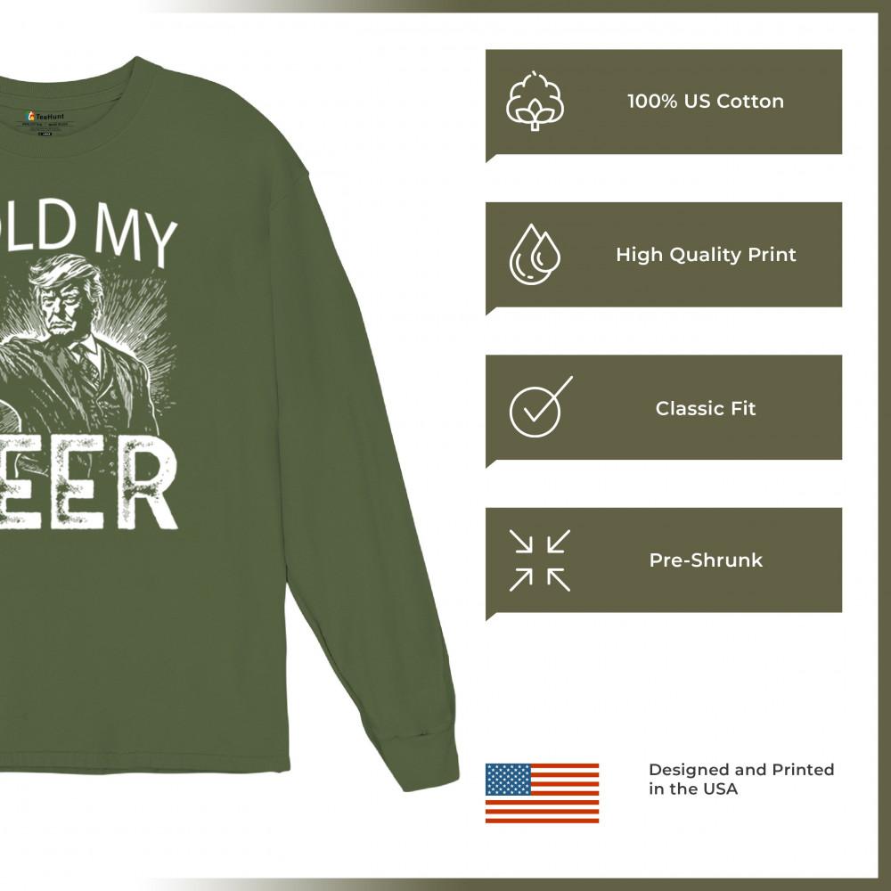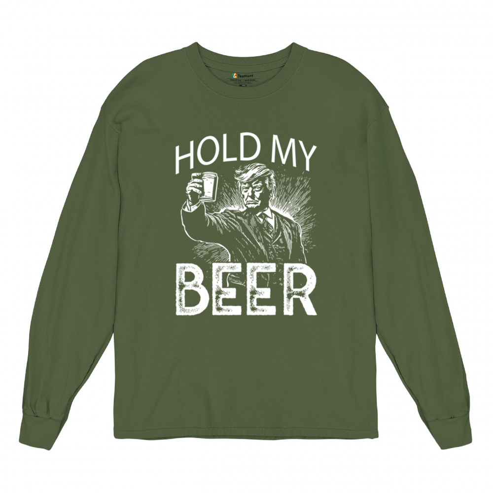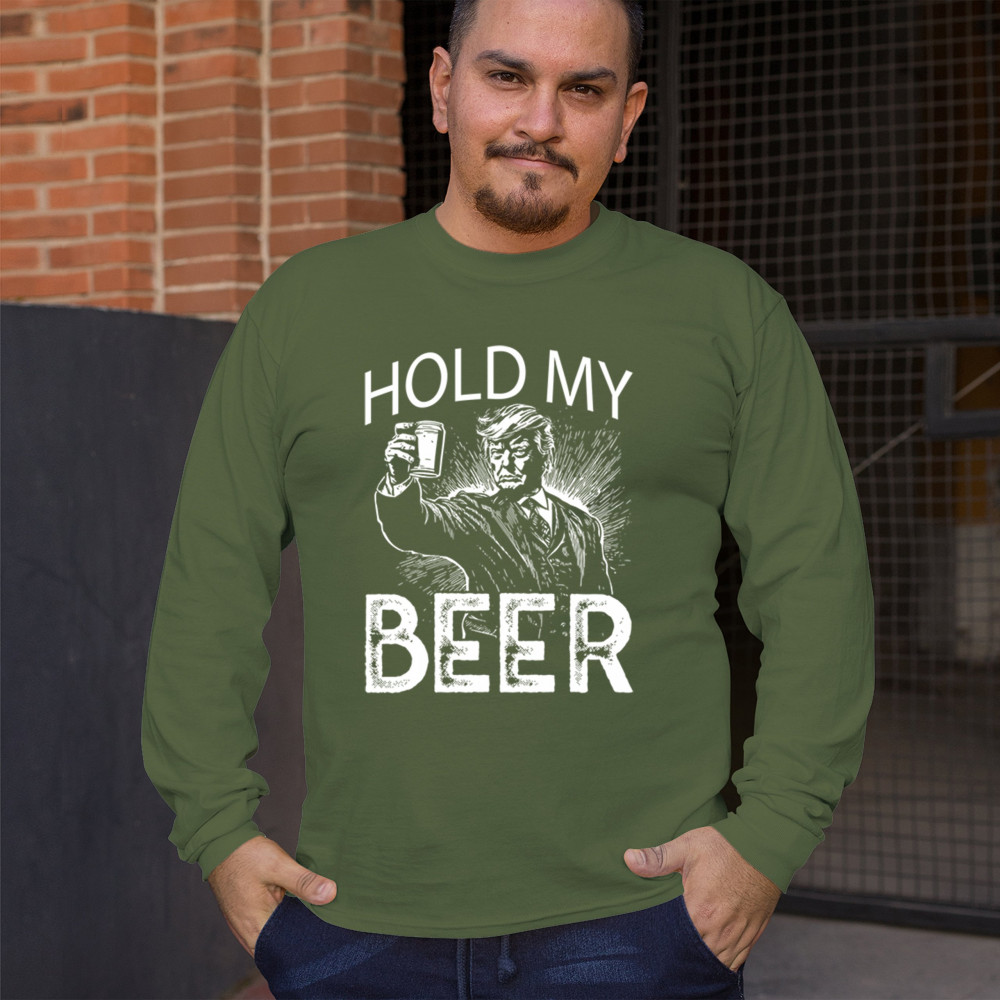 Celebrate the boldness of America First with the "Hold My Beer" design. A tribute to Trump supporters, conservatives, and proud patriots, this graphic humorously encapsulates the resilience and pride of the Red Wave movement. Perfect for rallies, casual gatherings, and those who proudly stand with Donald J. Trump, the 47th President, in the fight for freedom and the people's mandate.