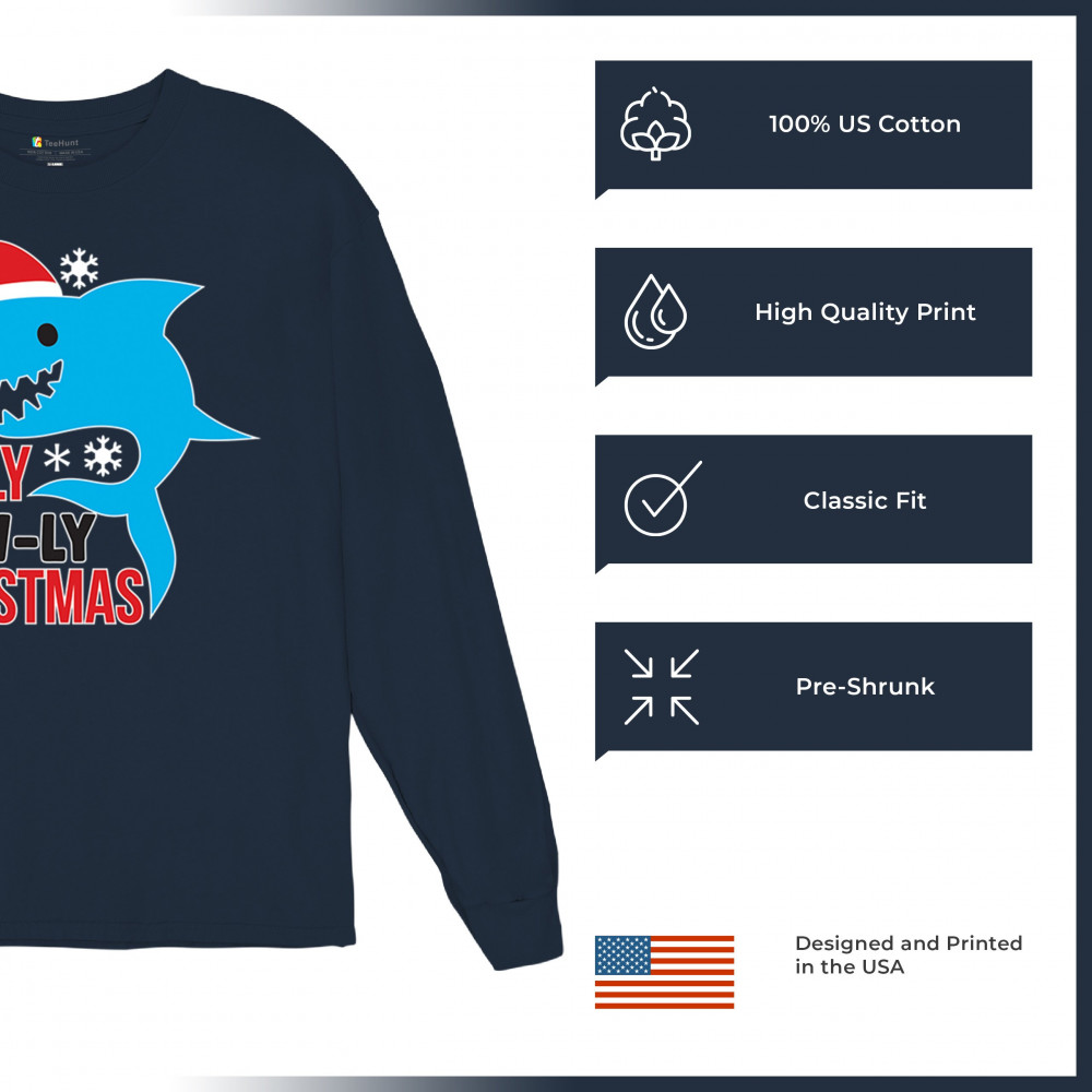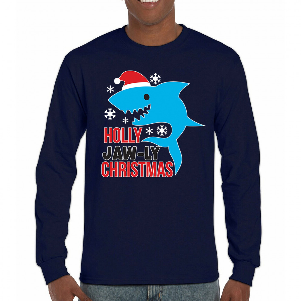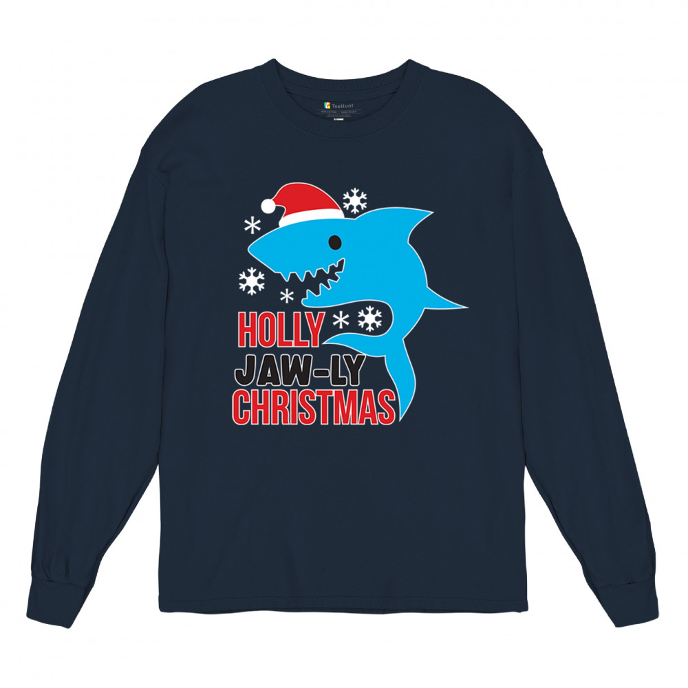 Funny Holly Jaw-ly Christmas shark pun design with Santa hat and snowflakes. Perfect for ocean lovers, festive parties, and cheerful holiday fun.