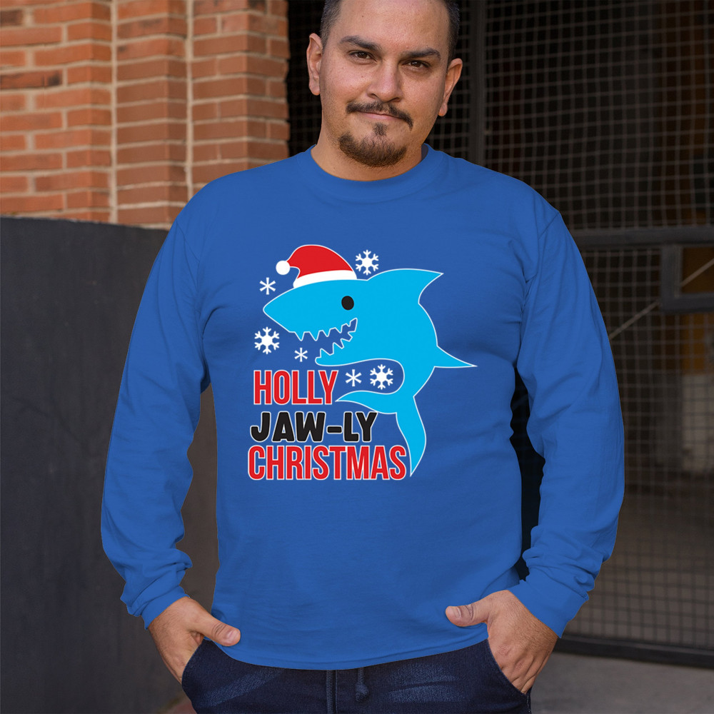 Funny Holly Jaw-ly Christmas shark pun design with Santa hat and snowflakes. Perfect for ocean lovers, festive parties, and cheerful holiday fun.