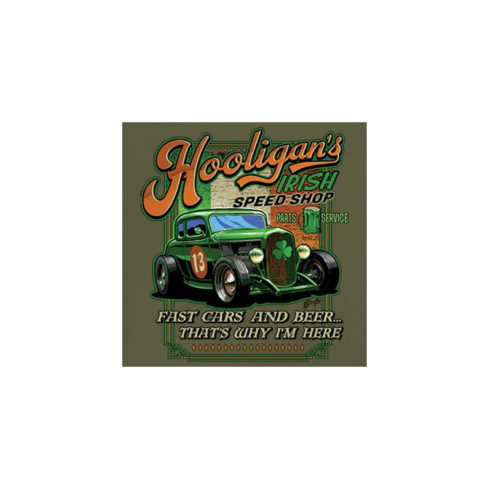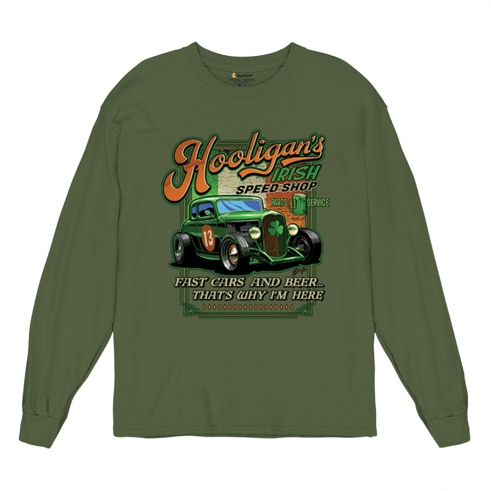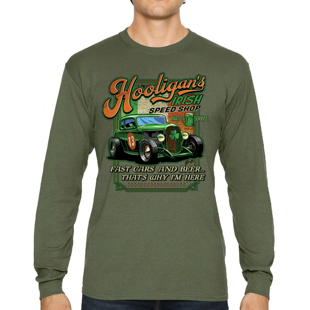 HOOLIGAN'S IRISH SPEED SHOP hooligans irish speed shop st patricks day long sleeve t-shirt hot rod shamrock military green