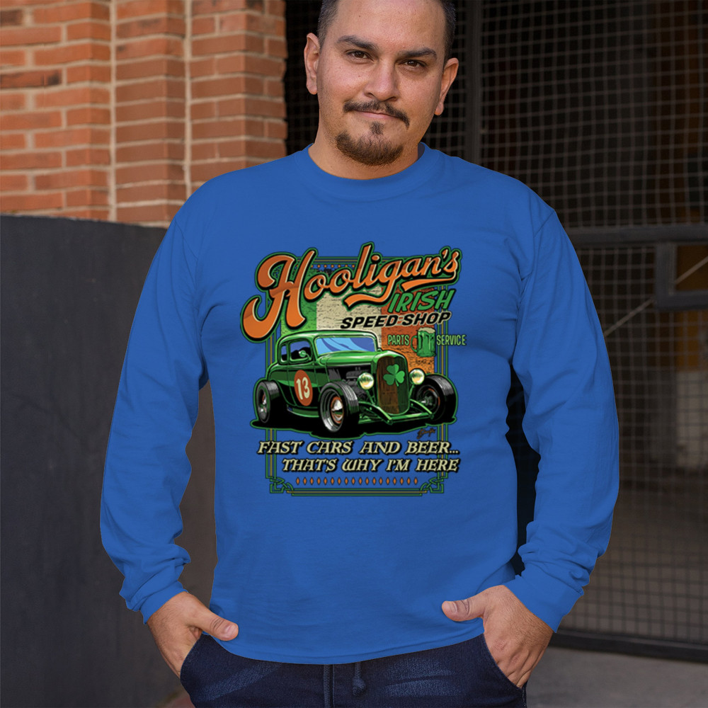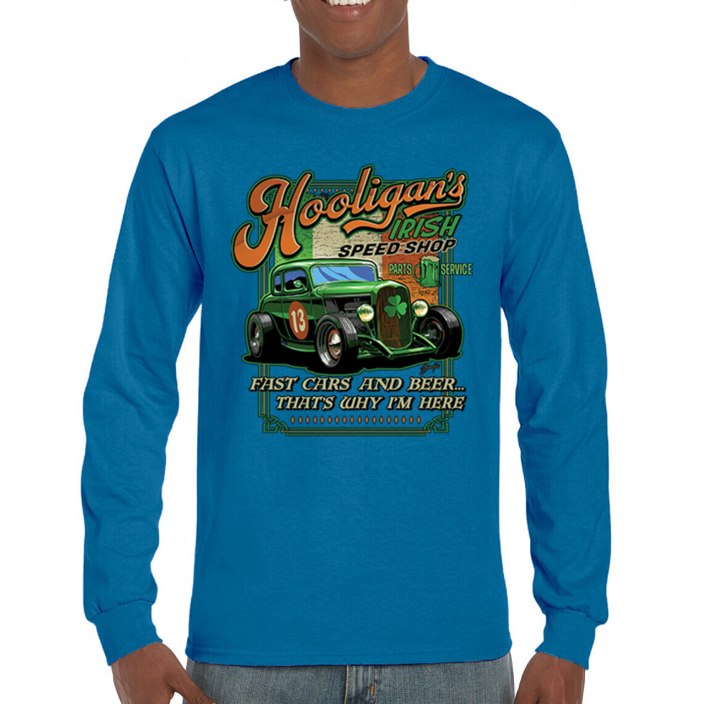 HOOLIGAN'S IRISH SPEED SHOP hooligans irish speed shop st patricks day long sleeve t-shirt hot rod shamrock royal blue