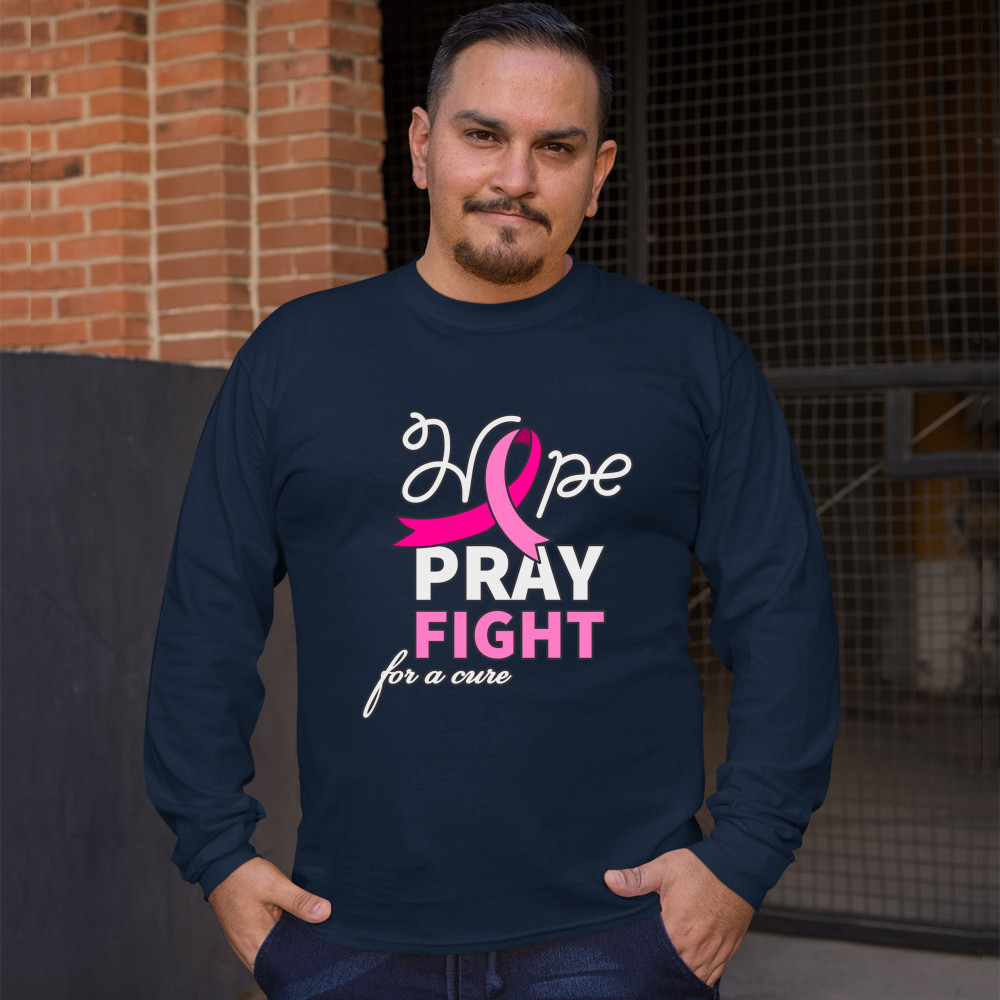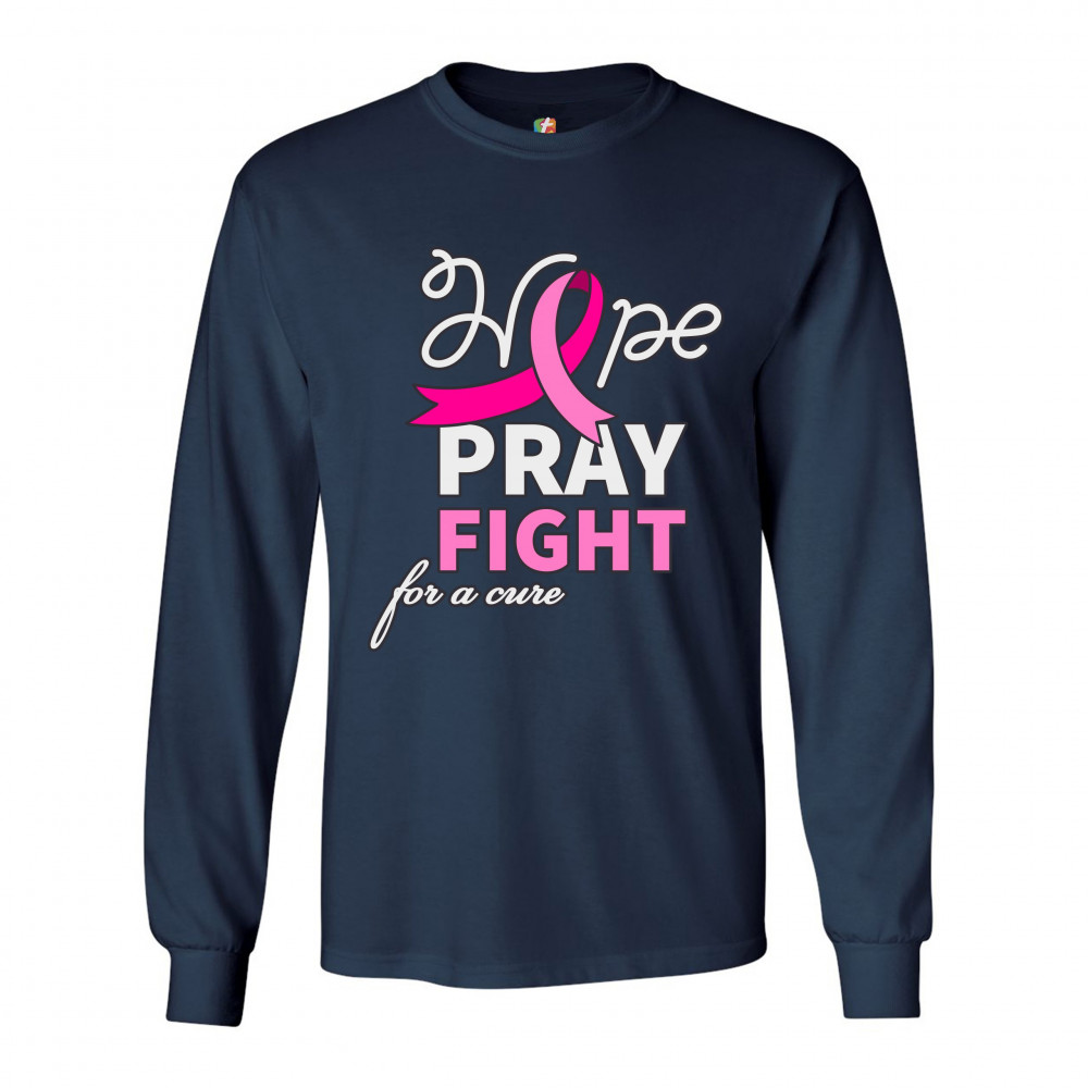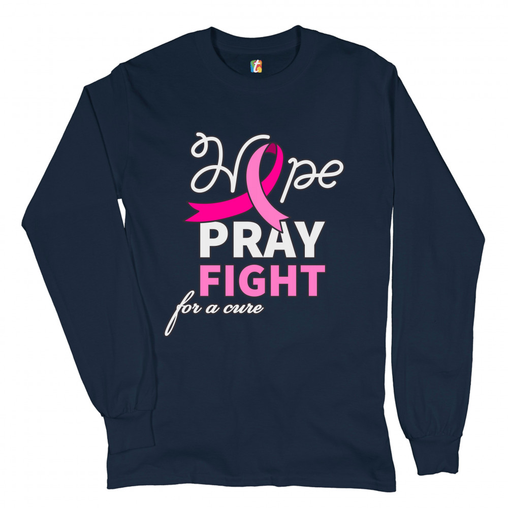 HOPE PRAY FIGHT FOR A CURE long sleeve t-shirt cancer awareness pink ribbon navy blue