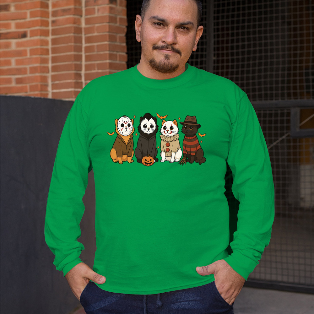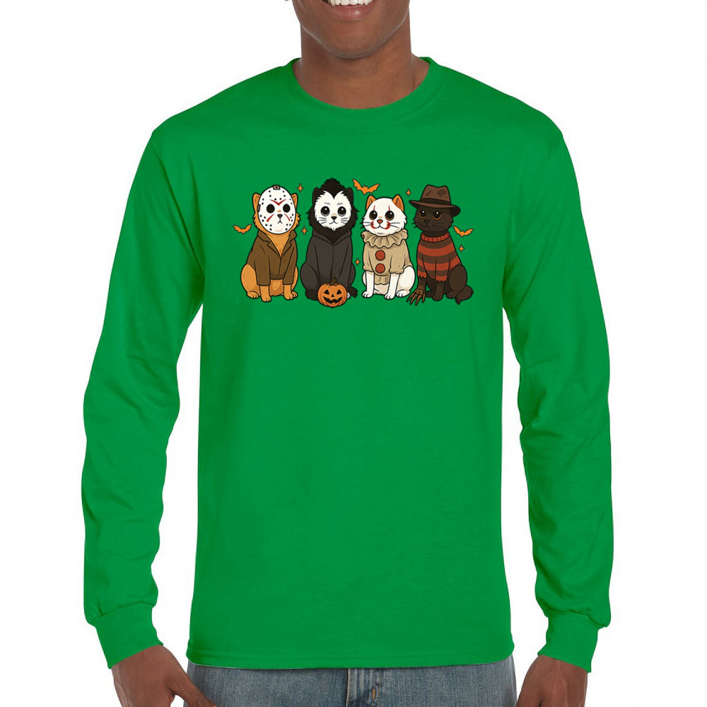 Horror Cats Halloween design with spooky costumes, Jack o Lantern details, and Haunted House vibes. Perfect October 31 outfit for cat lovers.