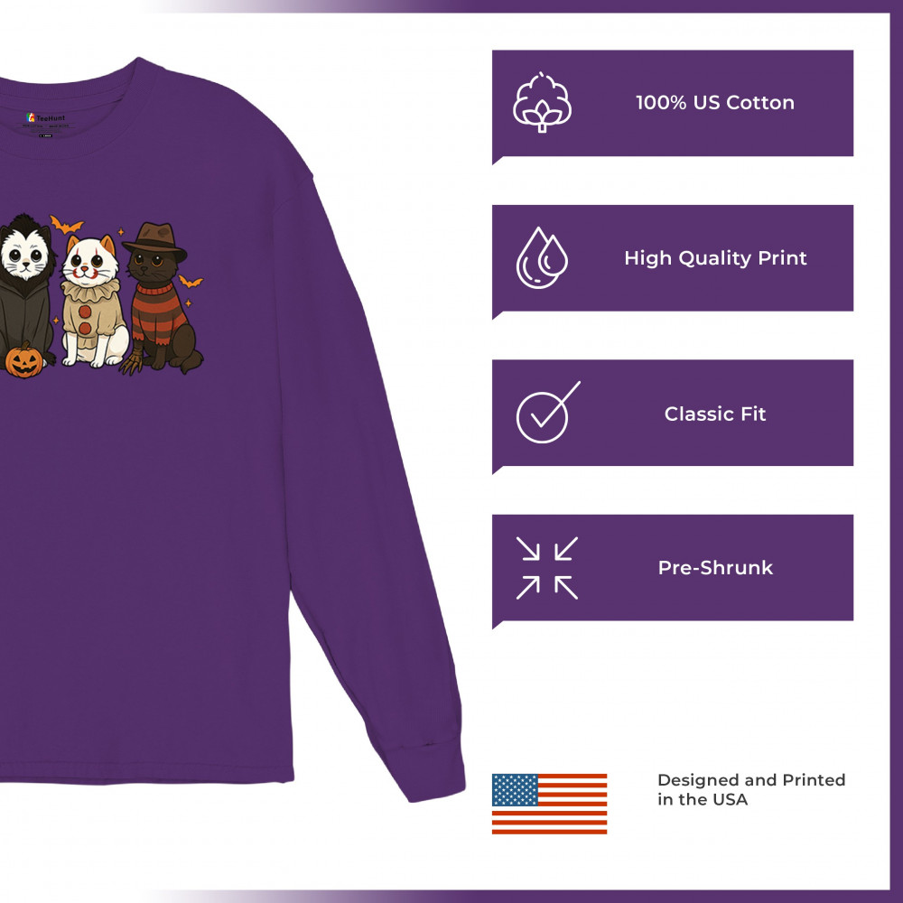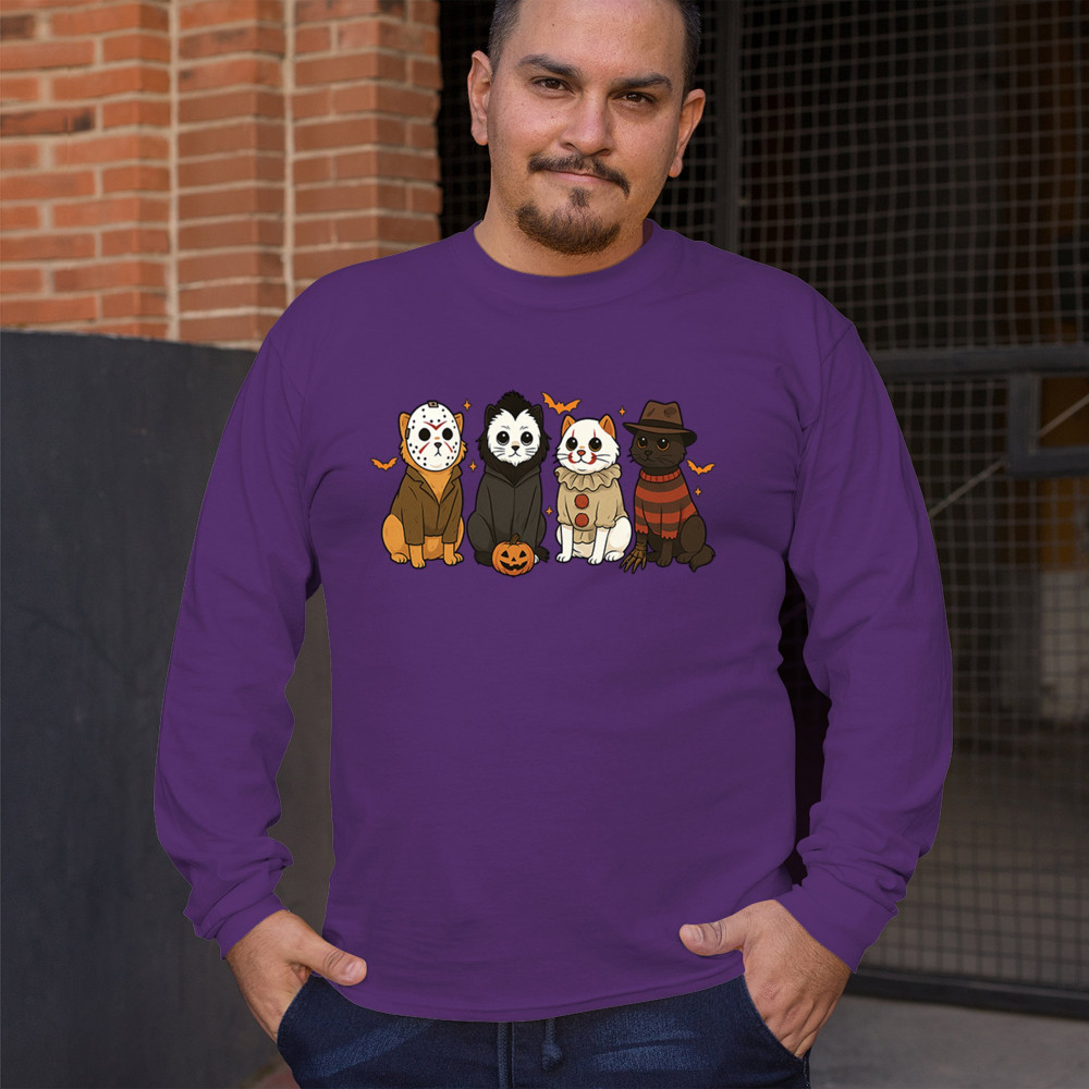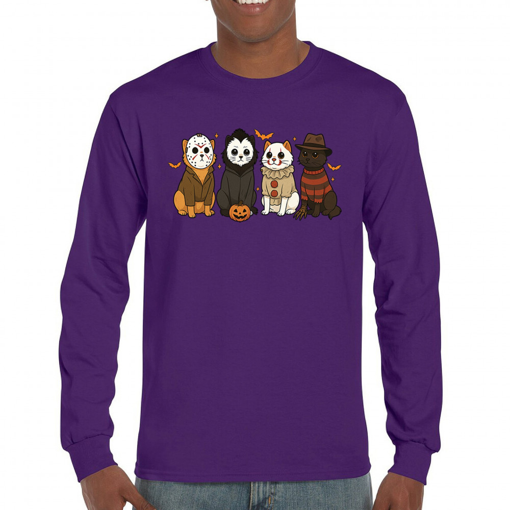 Horror Cats Halloween design with spooky costumes, Jack o Lantern details, and Haunted House vibes. Perfect October 31 outfit for cat lovers.