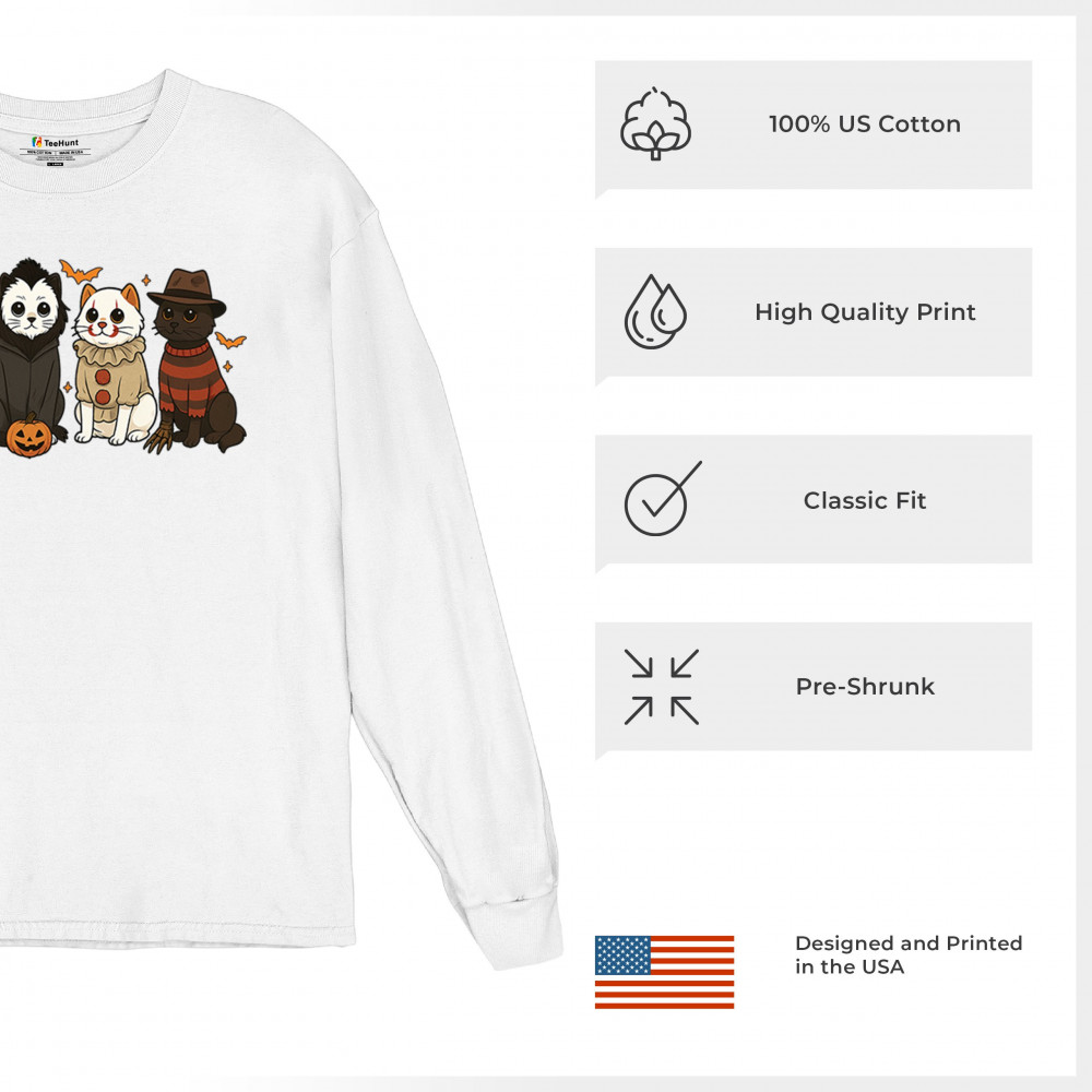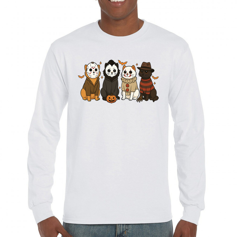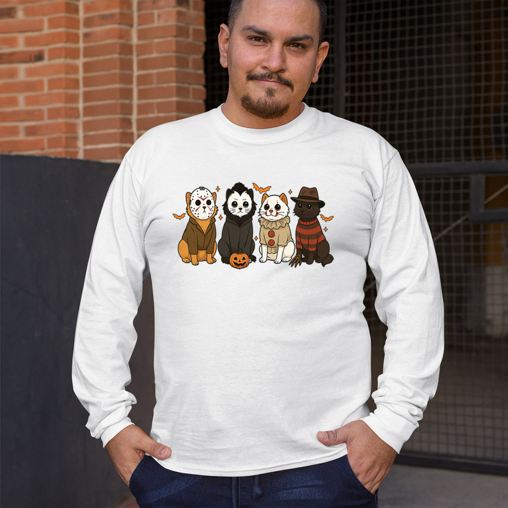 Horror Cats Halloween design with spooky costumes, Jack o Lantern details, and Haunted House vibes. Perfect October 31 outfit for cat lovers.