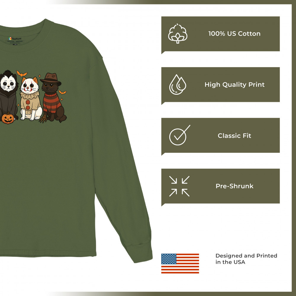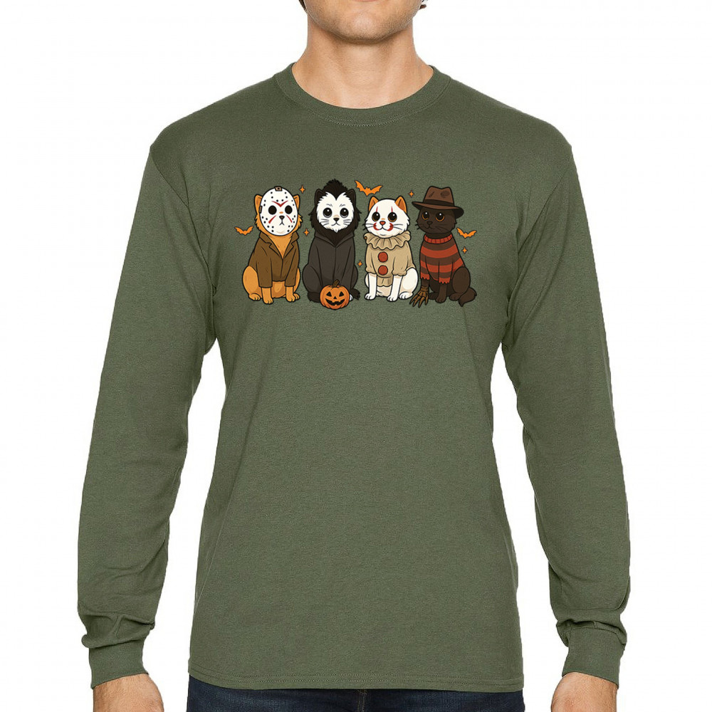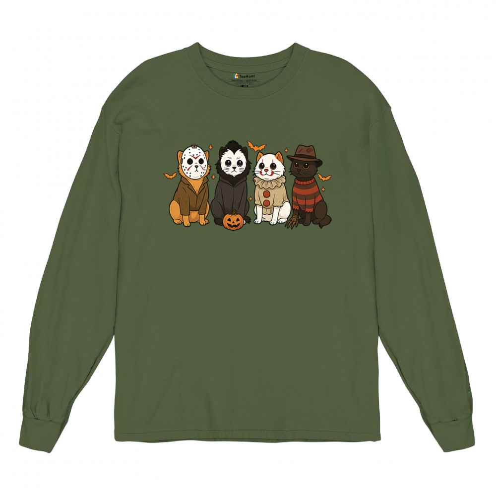 Horror Cats Halloween design with spooky costumes, Jack o Lantern details, and Haunted House vibes. Perfect October 31 outfit for cat lovers.