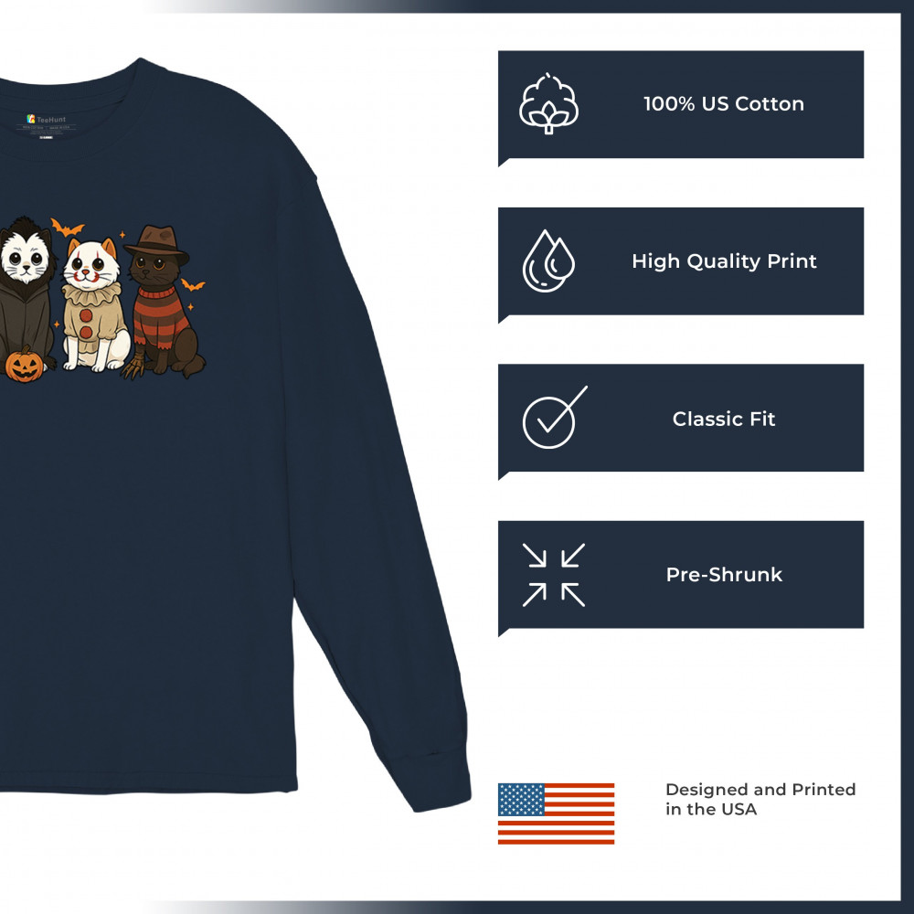 Horror Cats Halloween design with spooky costumes, Jack o Lantern details, and Haunted House vibes. Perfect October 31 outfit for cat lovers.