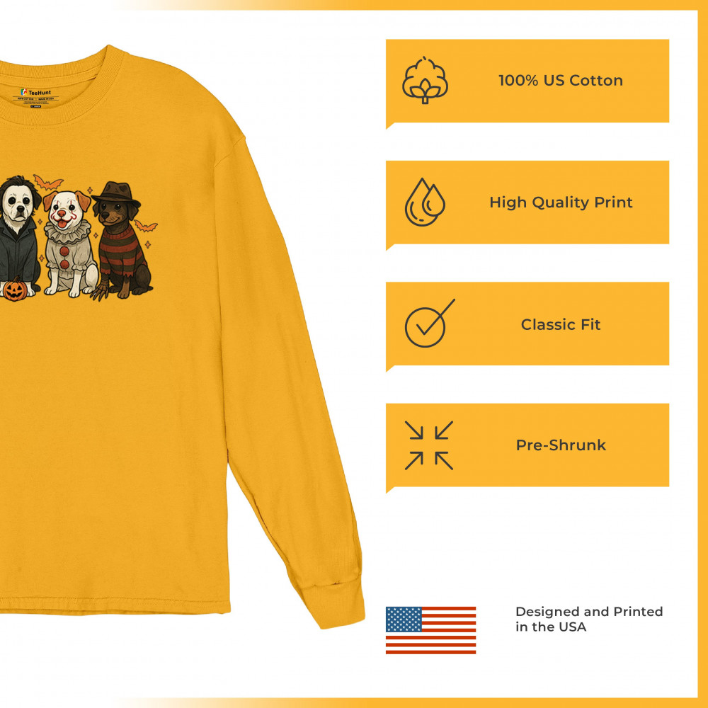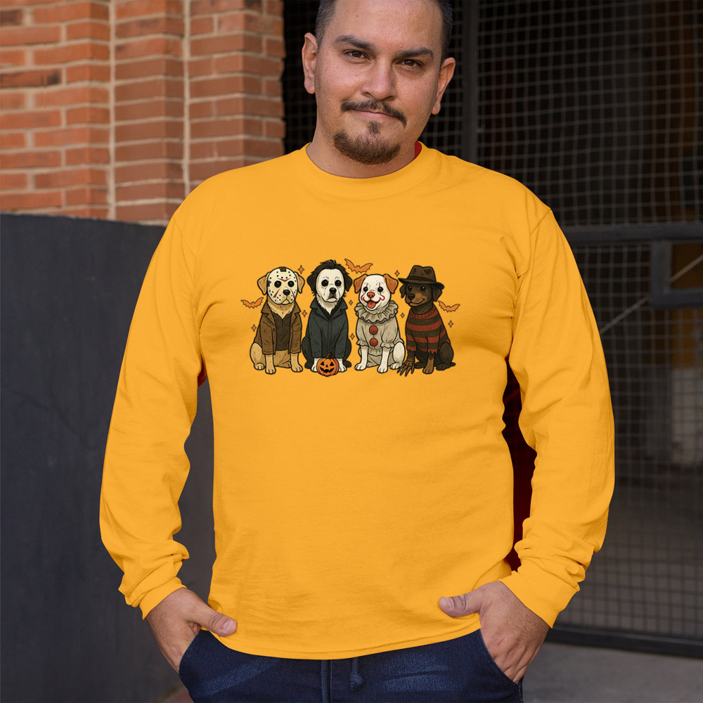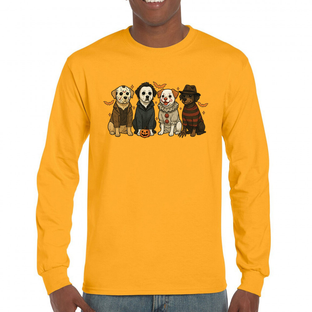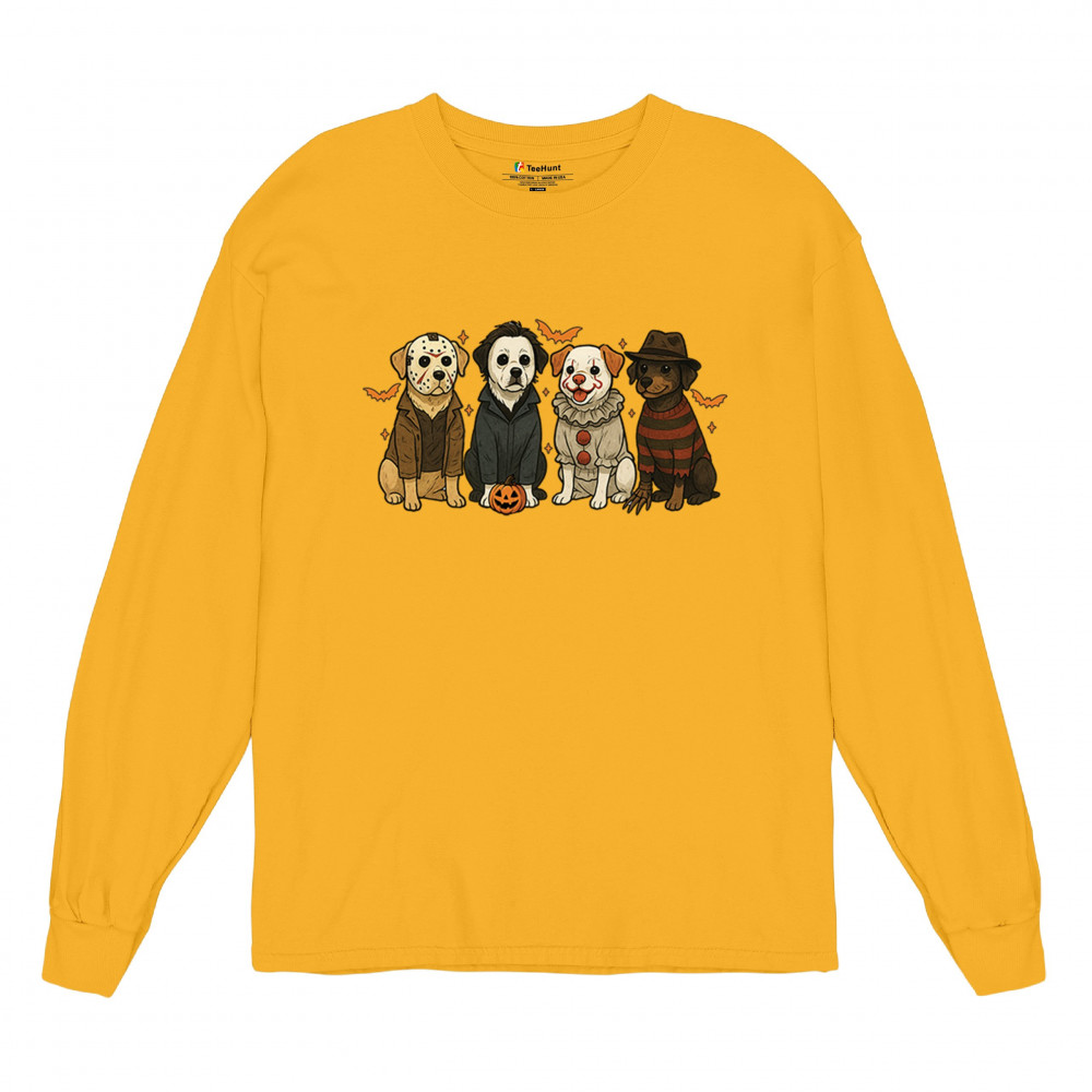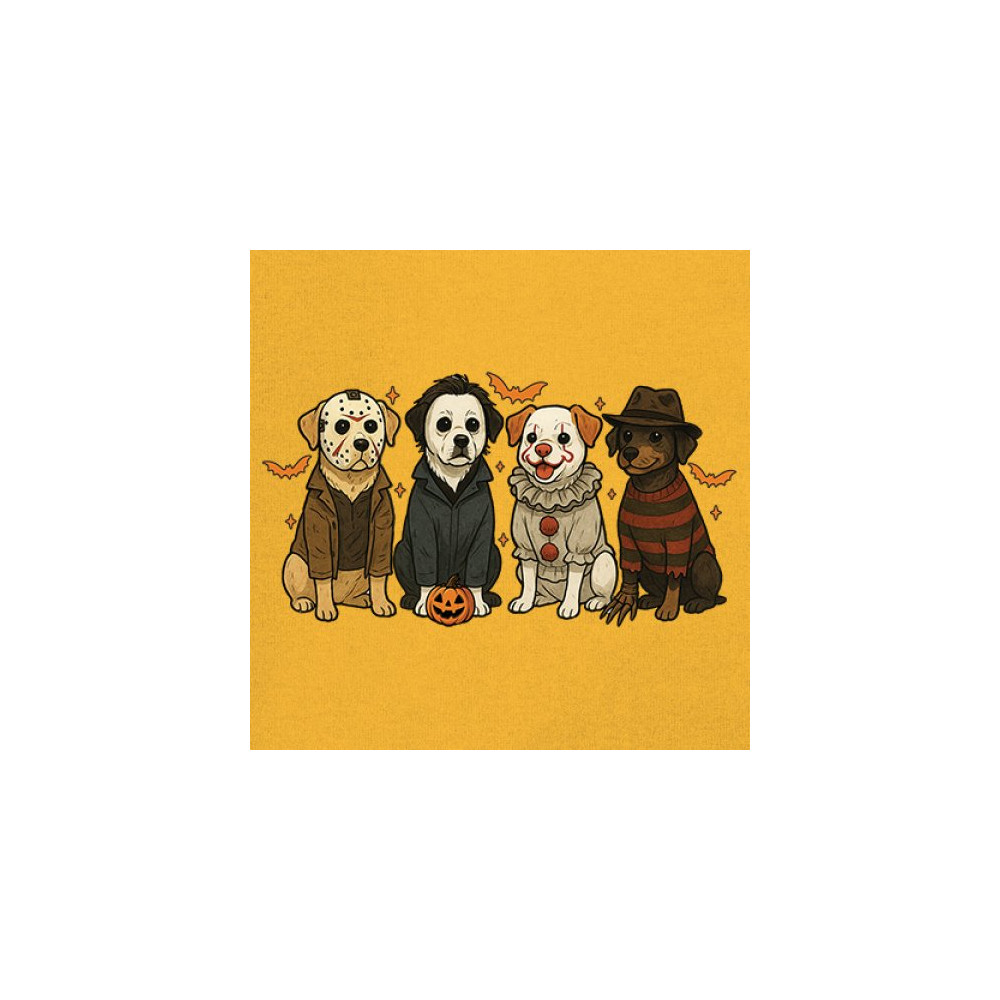 Celebrate Halloween with the Horror Dogs design featuring pups in creepy costumes inspired by spooky icons. A perfect pick for October 31 haunted house visits, autumn nights, or parties full of Halloween vibes. Whether you love dogs, witches, or pumpkin head fun, this festive design makes a playful addition to the spooky season.