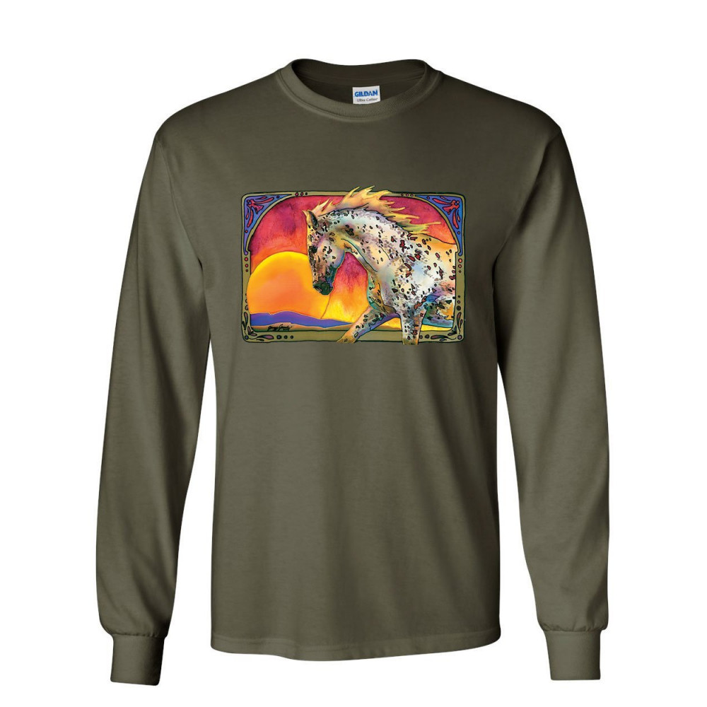 HORSE PRANCING IN SUNSET long sleeve t-shirt animal wildlife mare stallion tee military green