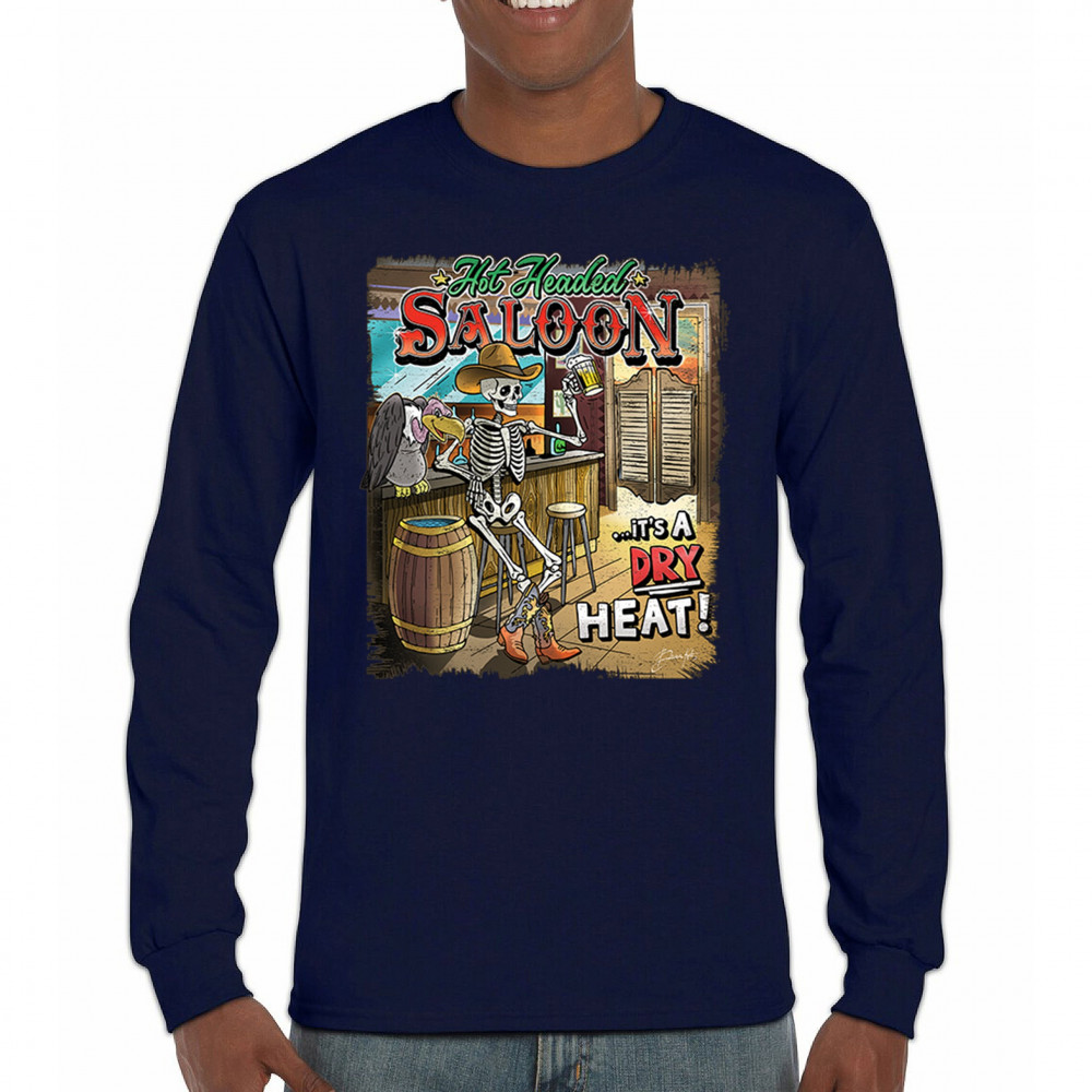 Raise a glass to style with our 'Hot Headed Saloon' t-shirt! Featuring a skeletal mixologist in a desert tavern, this tee blends humor with high-stakes western drama. Crafted for those who take their style like their whiskey – strong and full of character – it's more than just apparel; it's a wearable tale of the wild, wild west. Add this conversation piece to your collection and tip your hat to a bygone era with a laugh.