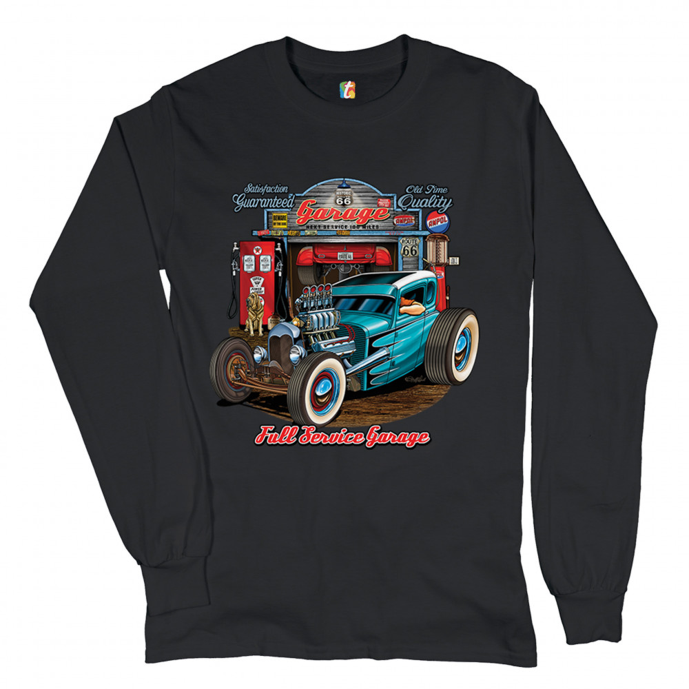 A print featuring a beautiful blue hot rod and a garage behind it. The garage has numerous signs on it which says :"Satisfaction guaranteed", "Old time quality", "Historic Route 66". Under the car it says: "Full service garage". Great for Route 66 and hot rod fans.