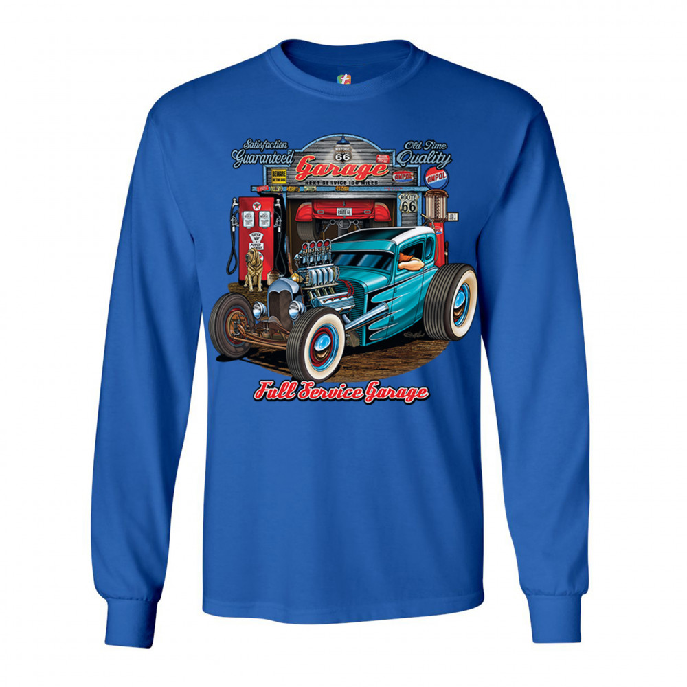 A print featuring a beautiful blue hot rod and a garage behind it. The garage has numerous signs on it which says :"Satisfaction guaranteed", "Old time quality", "Historic Route 66". Under the car it says: "Full service garage". Great for Route 66 and hot rod fans.