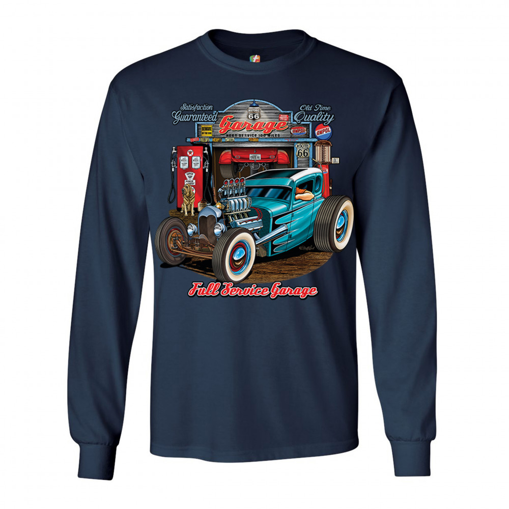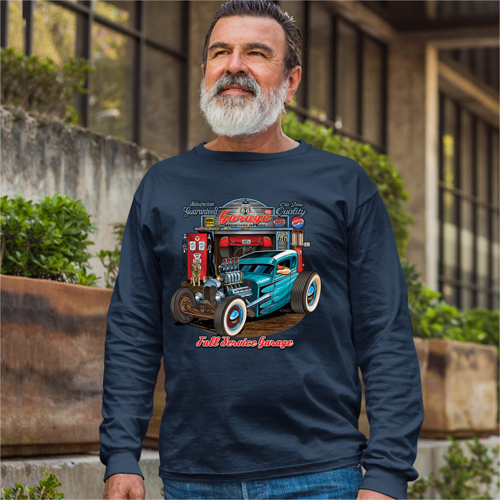A print featuring a beautiful blue hot rod and a garage behind it. The garage has numerous signs on it which says :"Satisfaction guaranteed", "Old time quality", "Historic Route 66". Under the car it says: "Full service garage". Great for Route 66 and hot rod fans.
