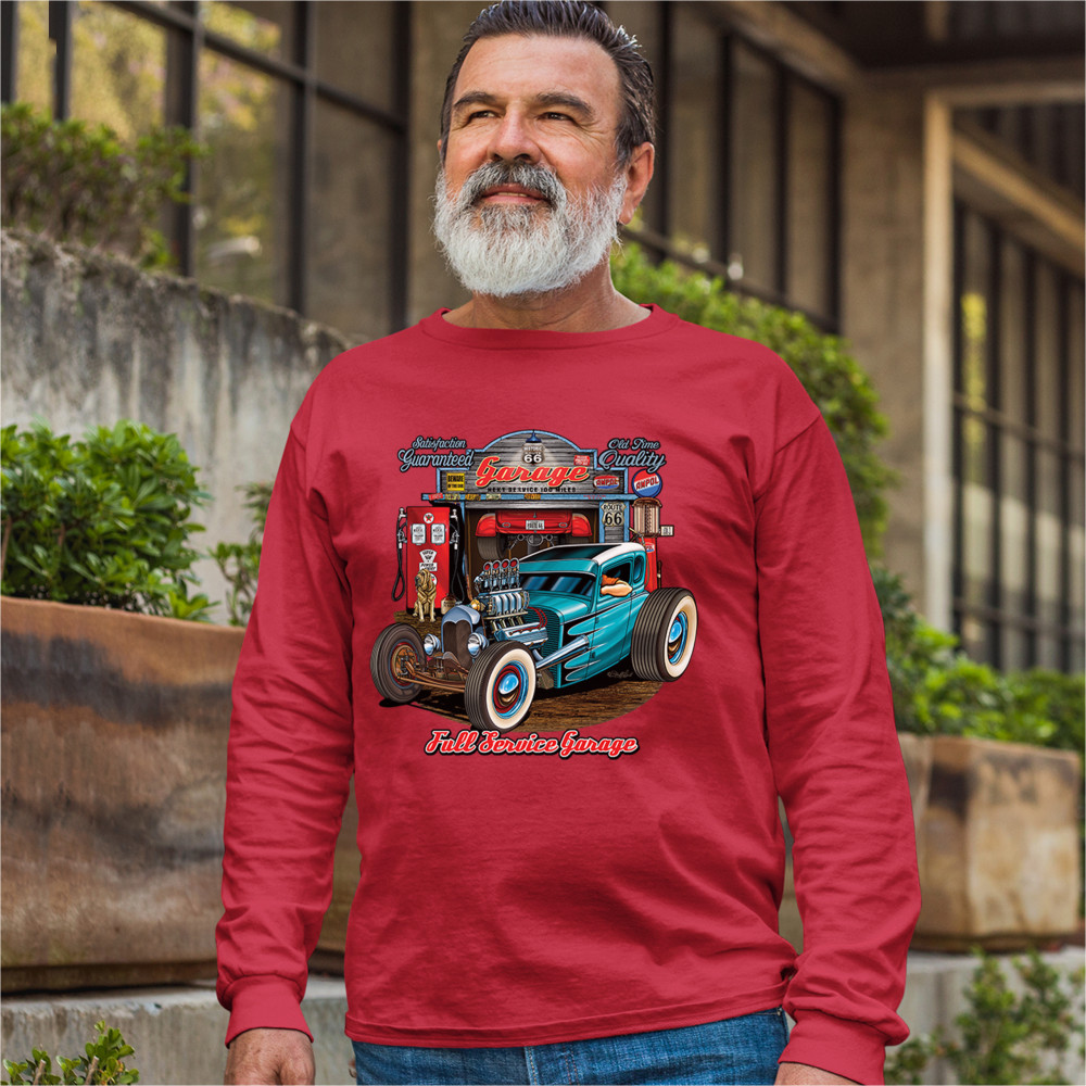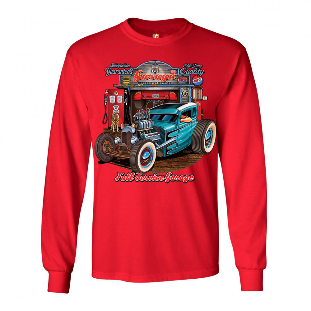 A print featuring a beautiful blue hot rod and a garage behind it. The garage has numerous signs on it which says :"Satisfaction guaranteed", "Old time quality", "Historic Route 66". Under the car it says: "Full service garage". Great for Route 66 and hot rod fans.