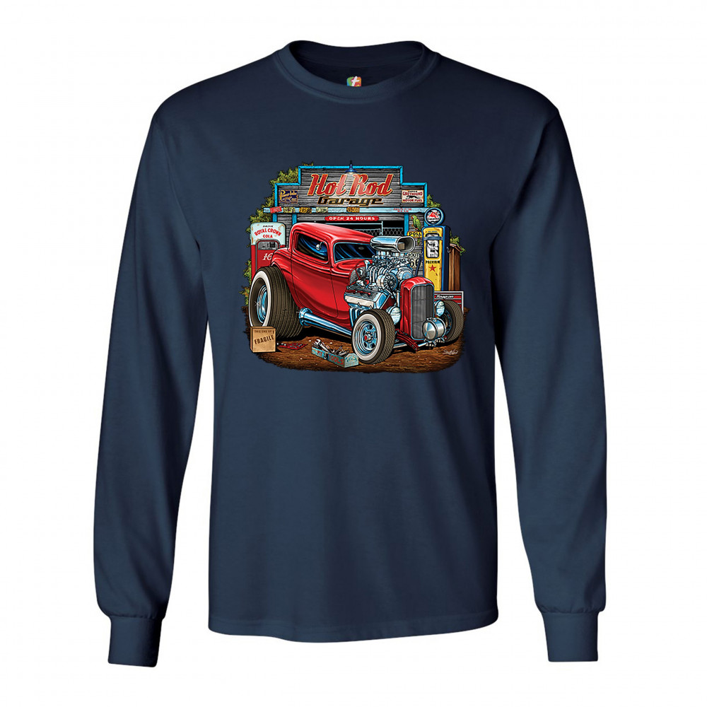 A print featuring a vintage hot rod with an exposed engine and plus-sized rear wheels. In the background there is a garage with a gas station and a sign that says: "Hot Rod Garage". A great choice for a fan of customized American classic cars and hot rods