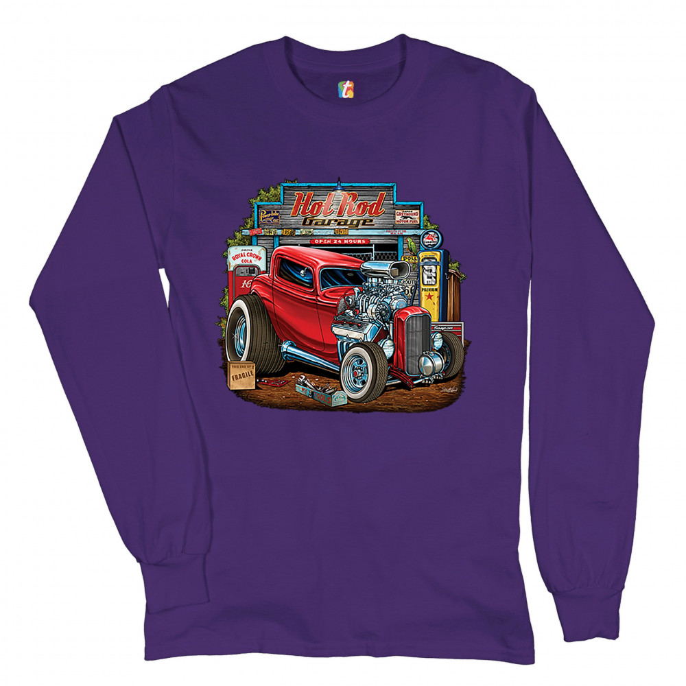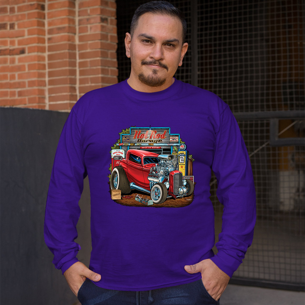 A print featuring a vintage hot rod with an exposed engine and plus-sized rear wheels. In the background there is a garage with a gas station and a sign that says: "Hot Rod Garage". A great choice for a fan of customized American classic cars and hot rods