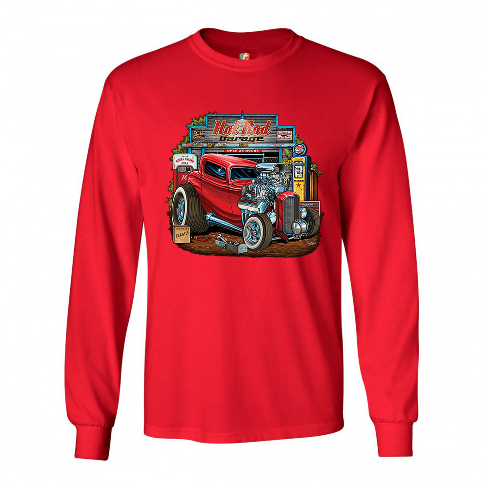 A print featuring a vintage hot rod with an exposed engine and plus-sized rear wheels. In the background there is a garage with a gas station and a sign that says: "Hot Rod Garage". A great choice for a fan of customized American classic cars and hot rods