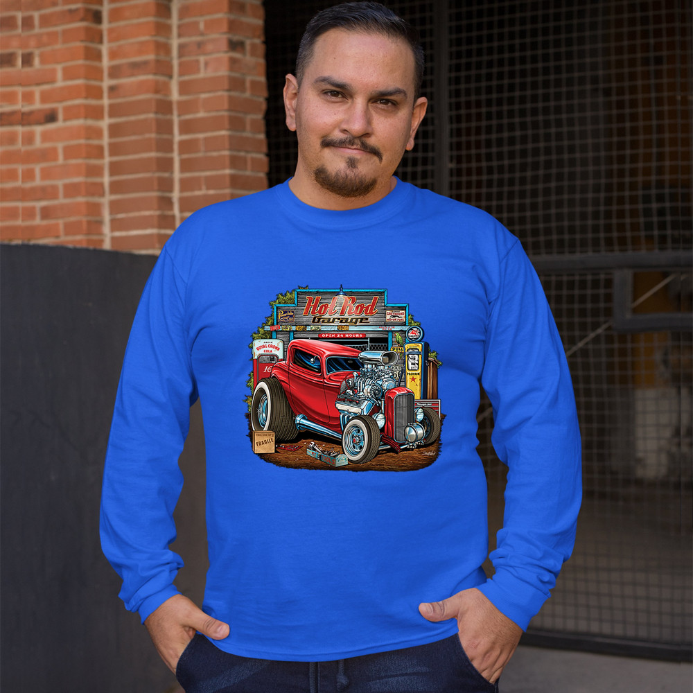 A print featuring a vintage hot rod with an exposed engine and plus-sized rear wheels. In the background there is a garage with a gas station and a sign that says: "Hot Rod Garage". A great choice for a fan of customized American classic cars and hot rods