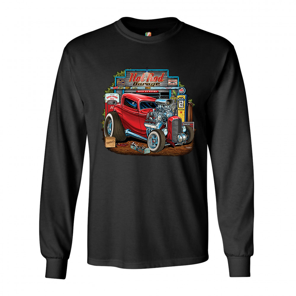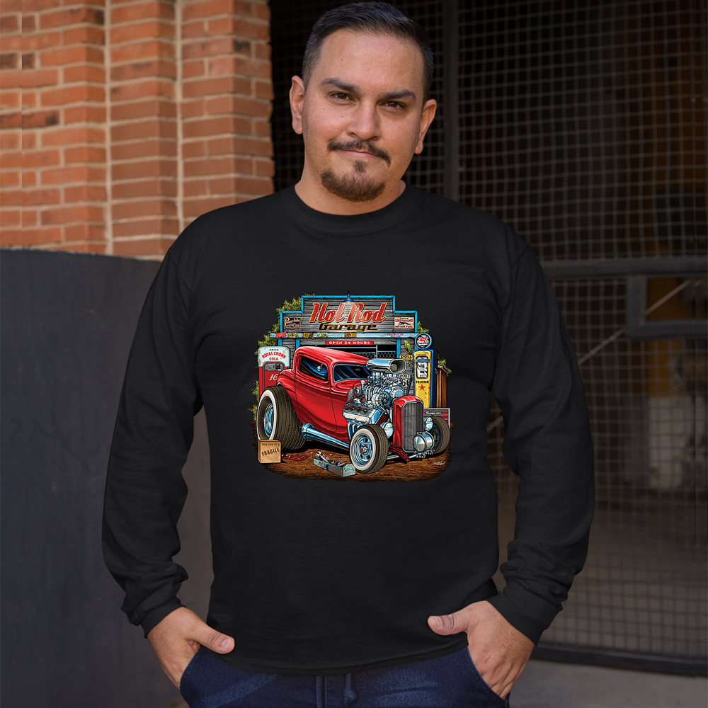 A print featuring a vintage hot rod with an exposed engine and plus-sized rear wheels. In the background there is a garage with a gas station and a sign that says: "Hot Rod Garage". A great choice for a fan of customized American classic cars and hot rods