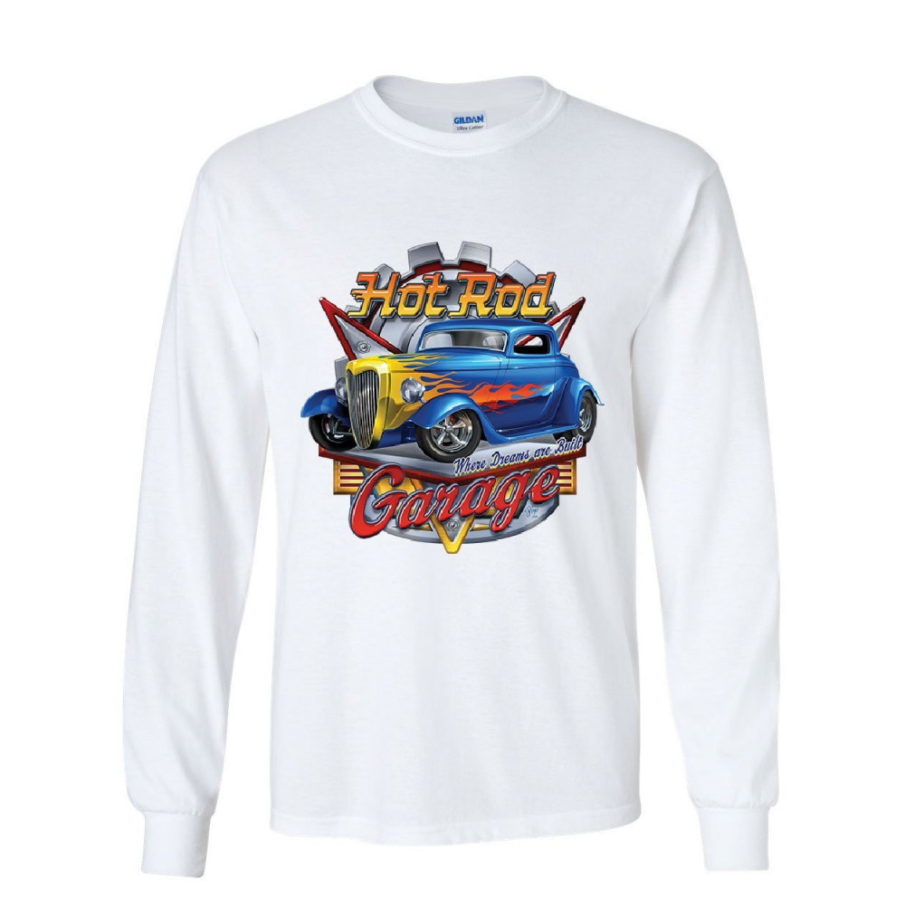 HOT ROD GARAGE long sleeve t-shirt where dreams are built us classic rebuild tee white