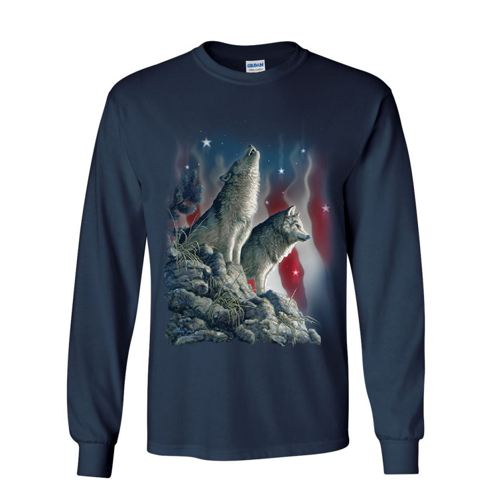 HOWLING WOLF PACK long sleeve t-shirt stars and stripes american wildlife tee navy blue