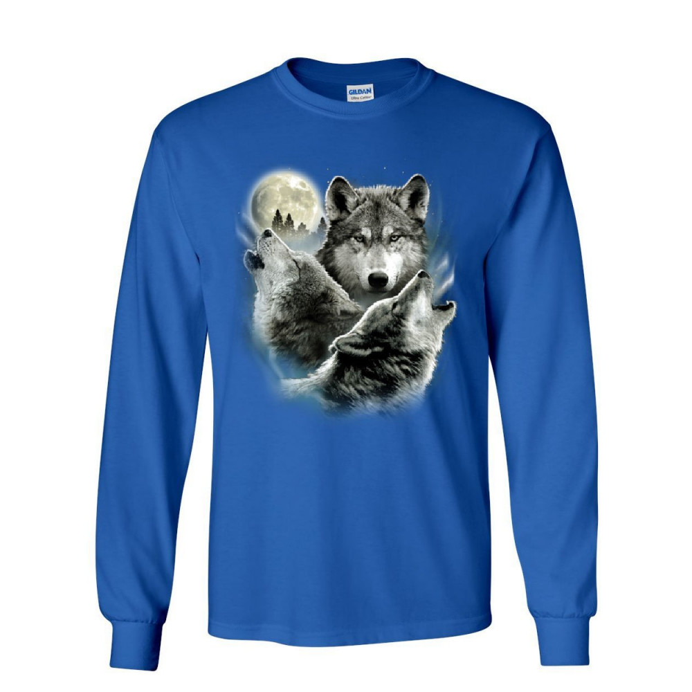 WOLF PACK HOWLING UP TO THE MOON howling wolf pack long sleeve t-shirt wild wilderness animals nature moon tee royal blue