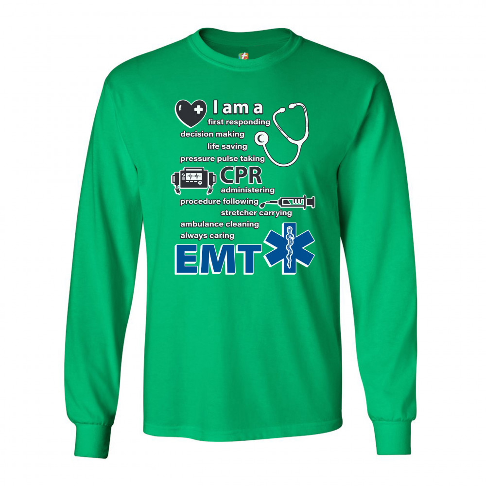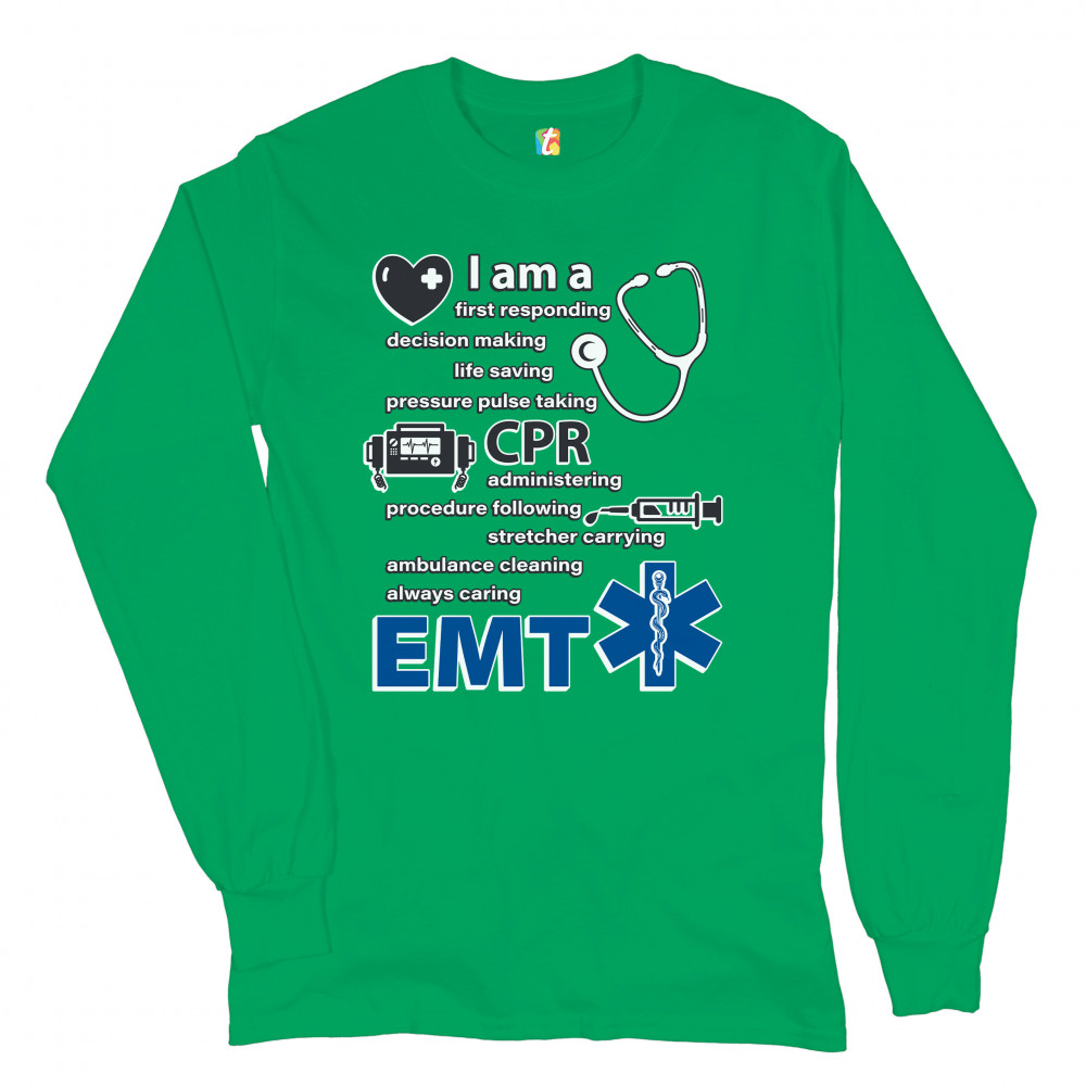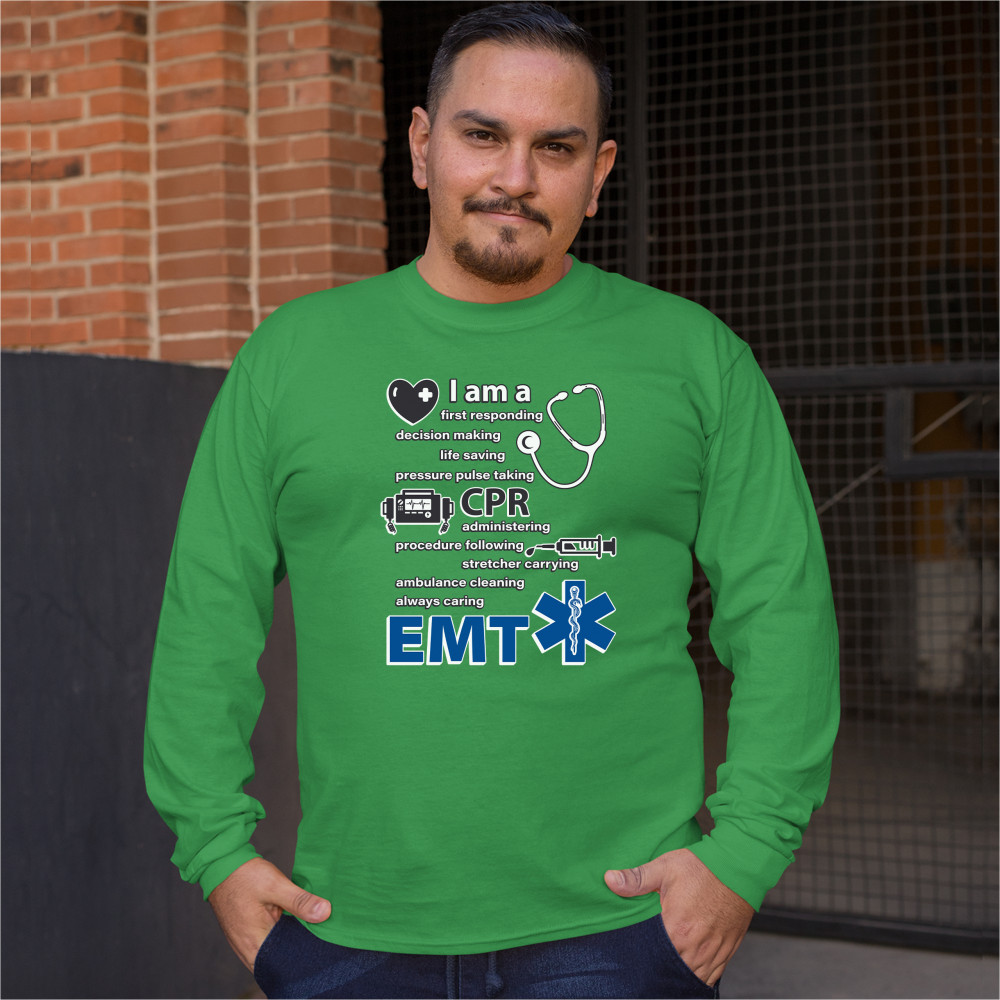 A print saying "I am a first responding, decision making, life saving, pressure pulse taking, CPR administering, procedure following, stretcher carrying, ambulance cleaning, always caring EMT". The print also features images of a heart, a stethoscope, a defibrillator, a syringe and the Star of Life. A great choice as a gift for a first responder.