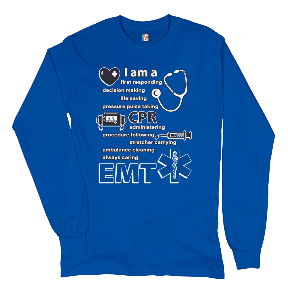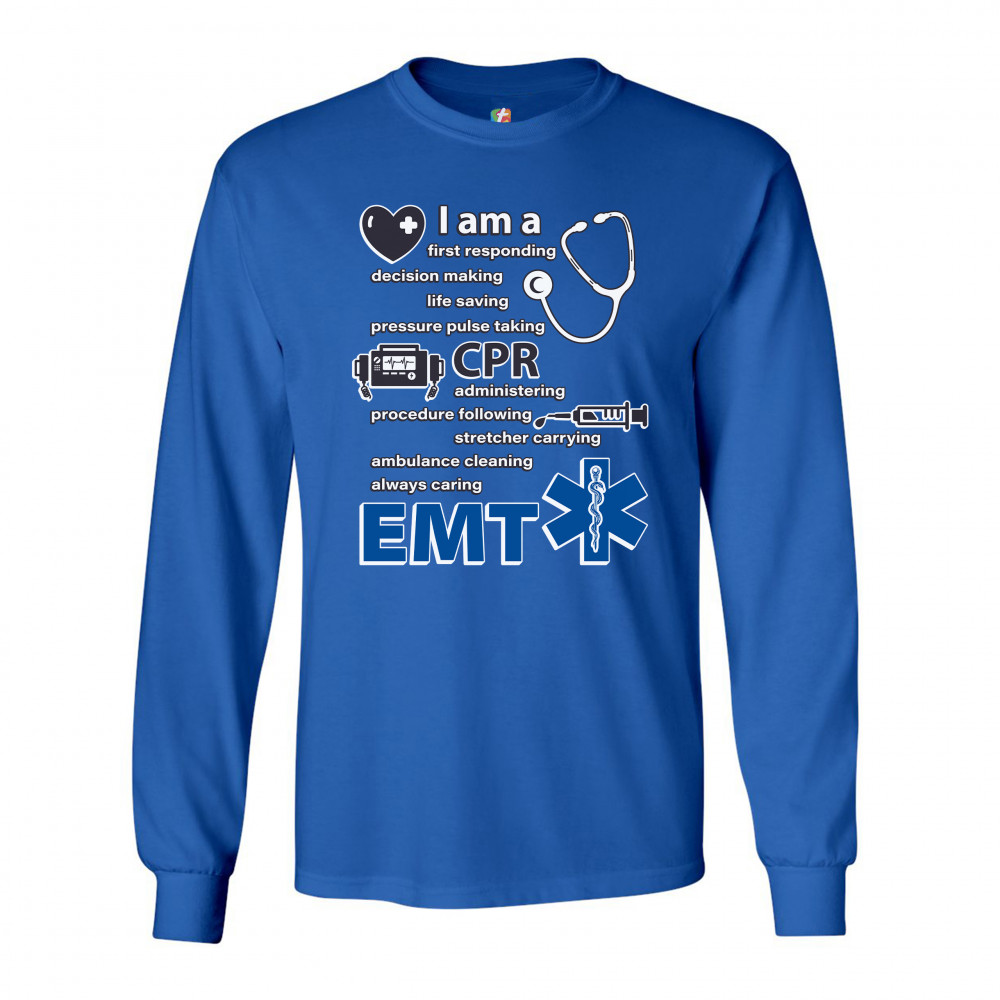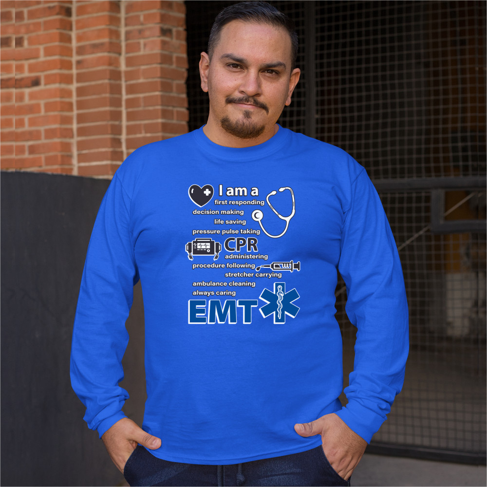 A print saying "I am a first responding, decision making, life saving, pressure pulse taking, CPR administering, procedure following, stretcher carrying, ambulance cleaning, always caring EMT". The print also features images of a heart, a stethoscope, a defibrillator, a syringe and the Star of Life. A great choice as a gift for a first responder.