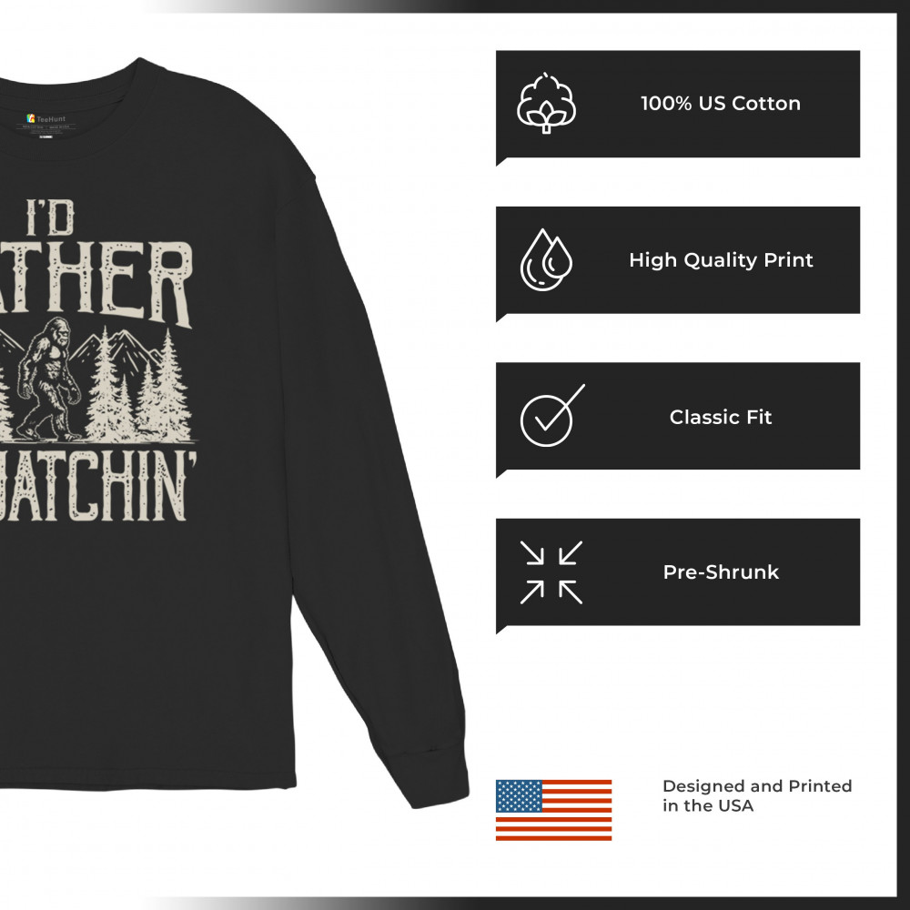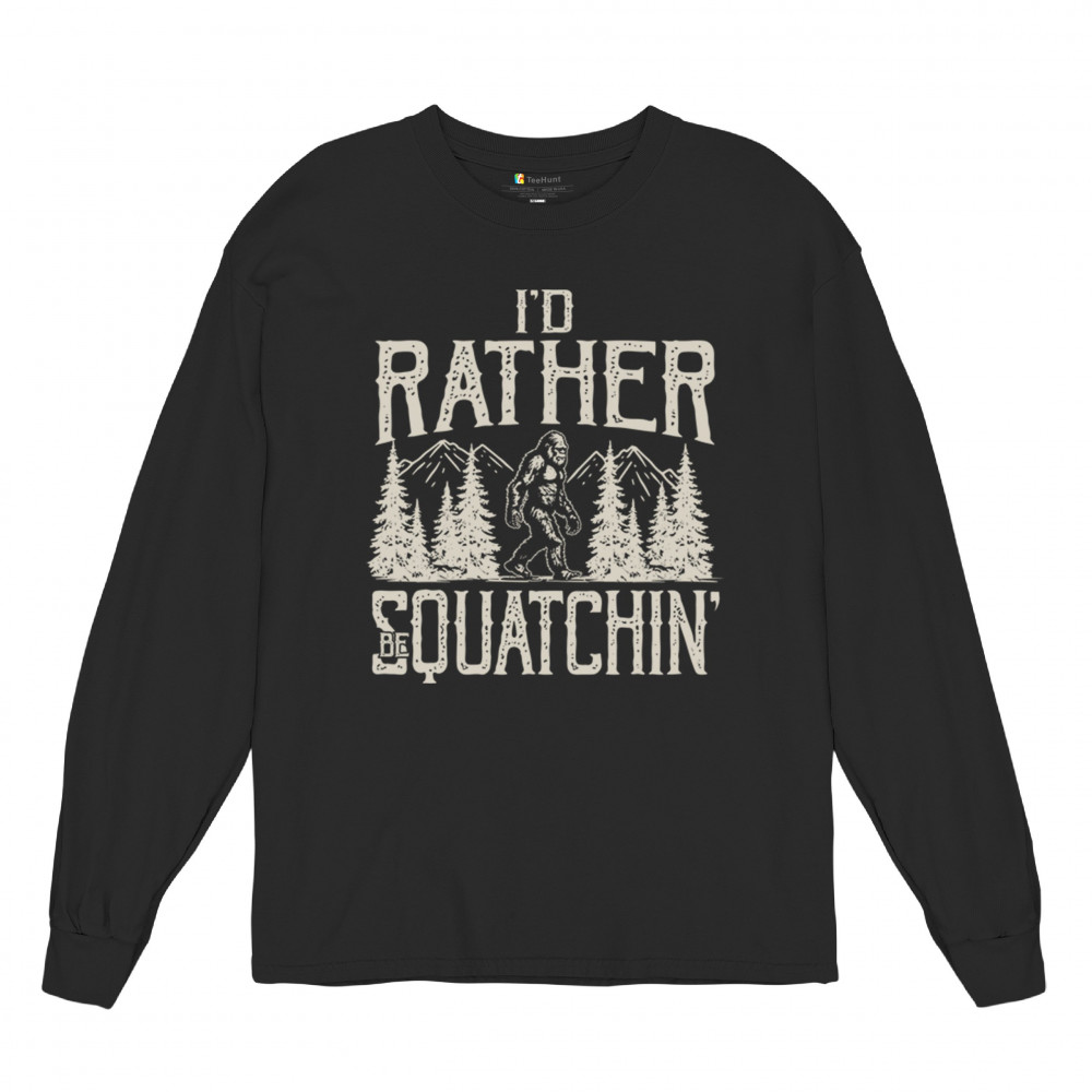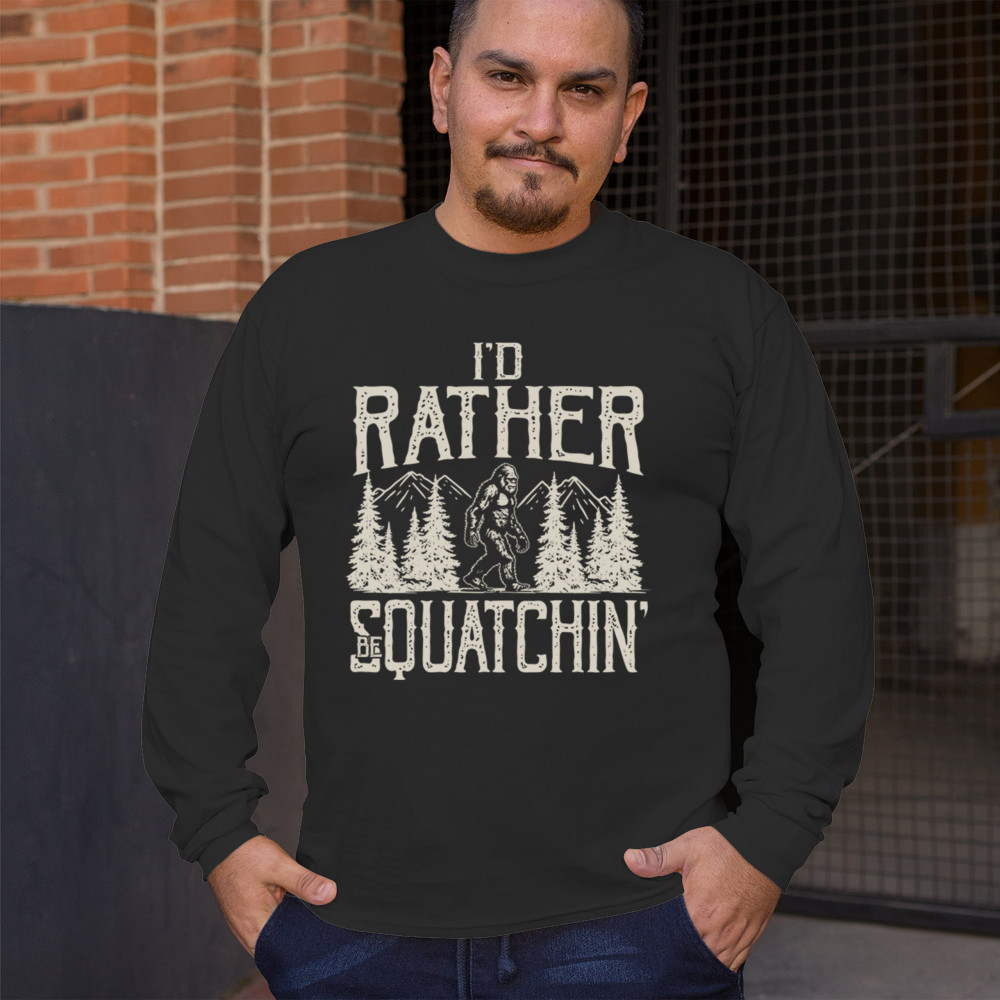 "I’d Rather Be Squatchin’" – A bold design for Bigfoot fans and outdoor adventurers, featuring Sasquatch in a wilderness setting. Perfect for hikers and cryptid enthusiasts!