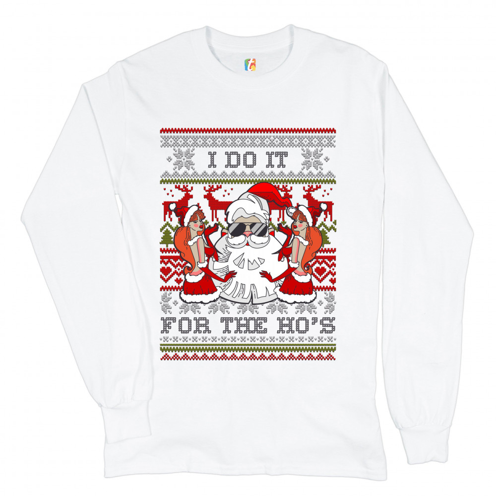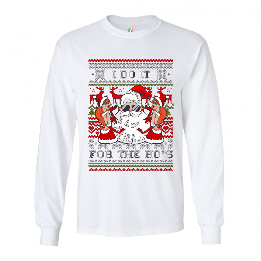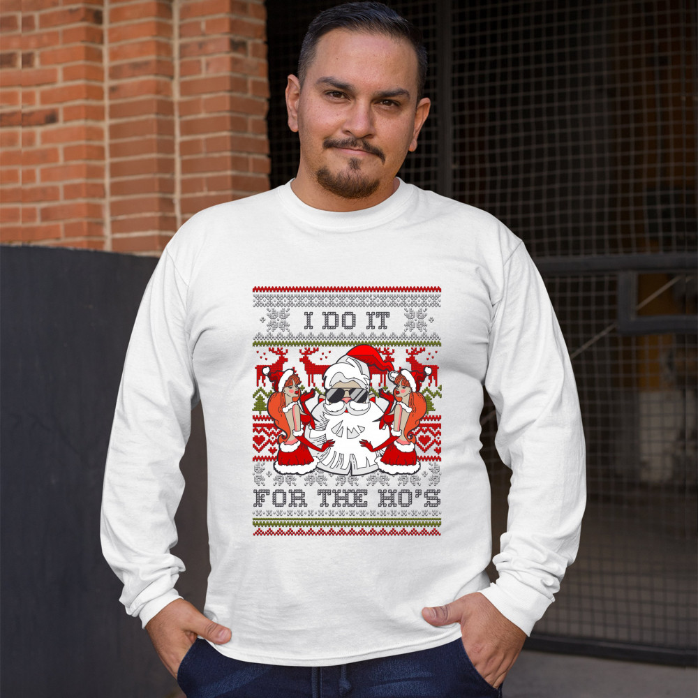 A funny print saying: "I do it for the ho's". It features a badass Santa Claus wearing sunglasses and two sexy girls in revealing Christmas outfits leaning on Santa's beard. The print is decorated wit the ugly sweater pattern in the background. Amazing ch