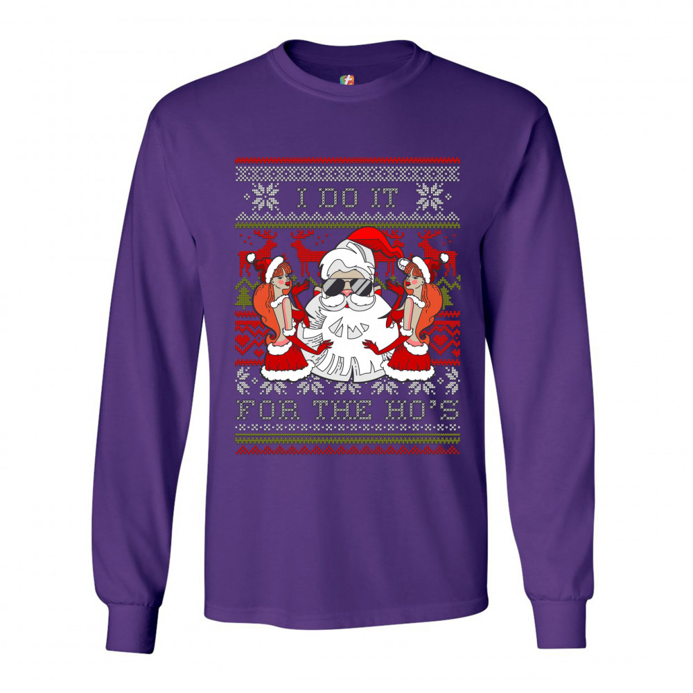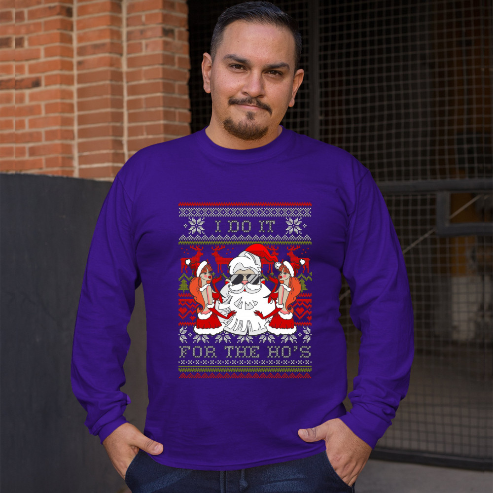 A funny print saying: "I do it for the ho's". It features a badass Santa Claus wearing sunglasses and two sexy girls in revealing Christmas outfits leaning on Santa's beard. The print is decorated wit the ugly sweater pattern in the background. Amazing ch