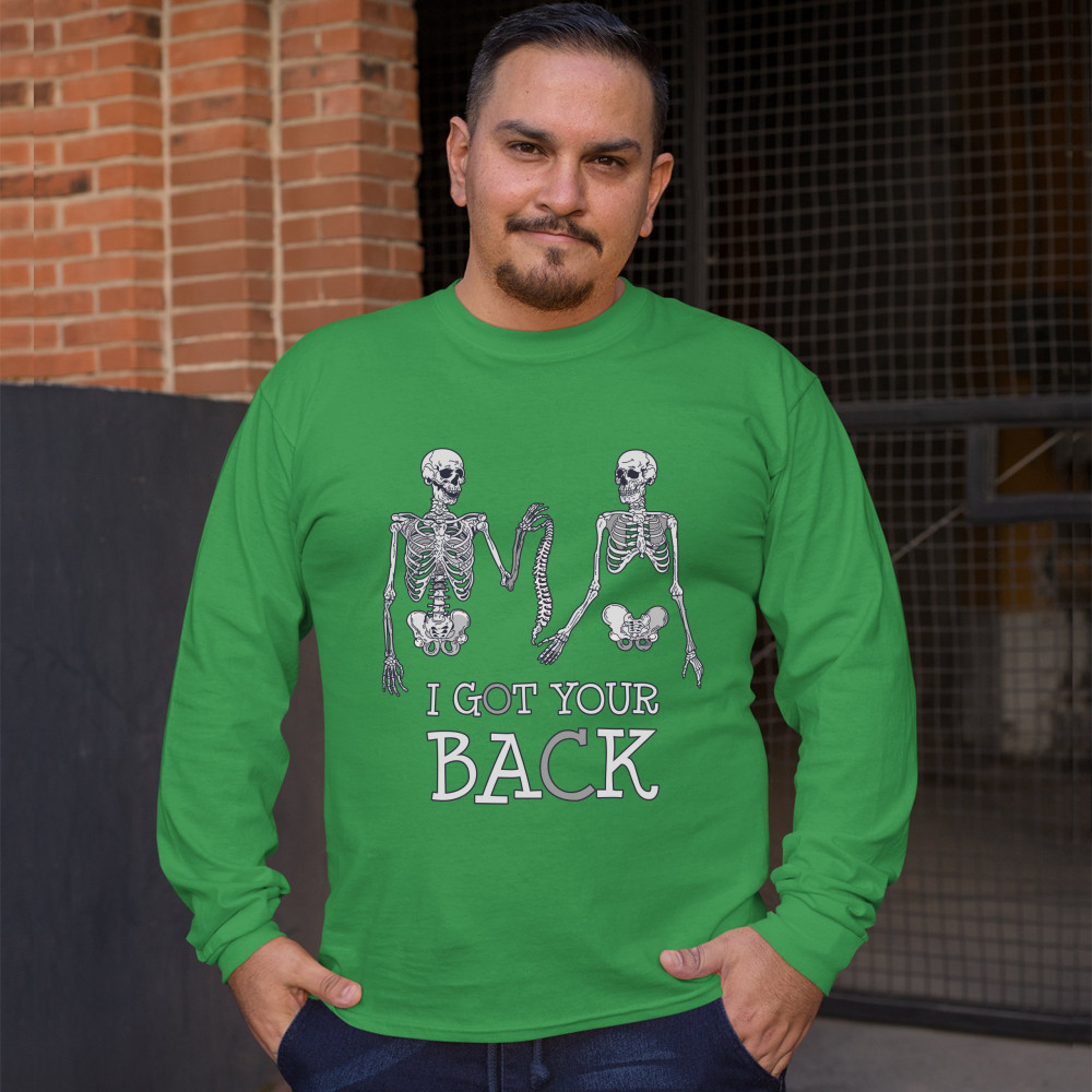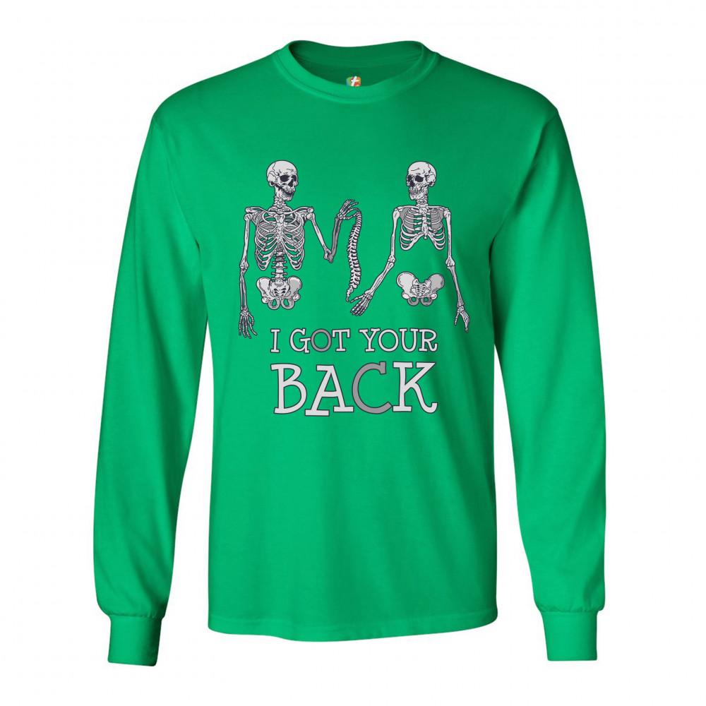 I GOT YOUR BACK long sleeve t-shirt happy halloween spooky skeletons green