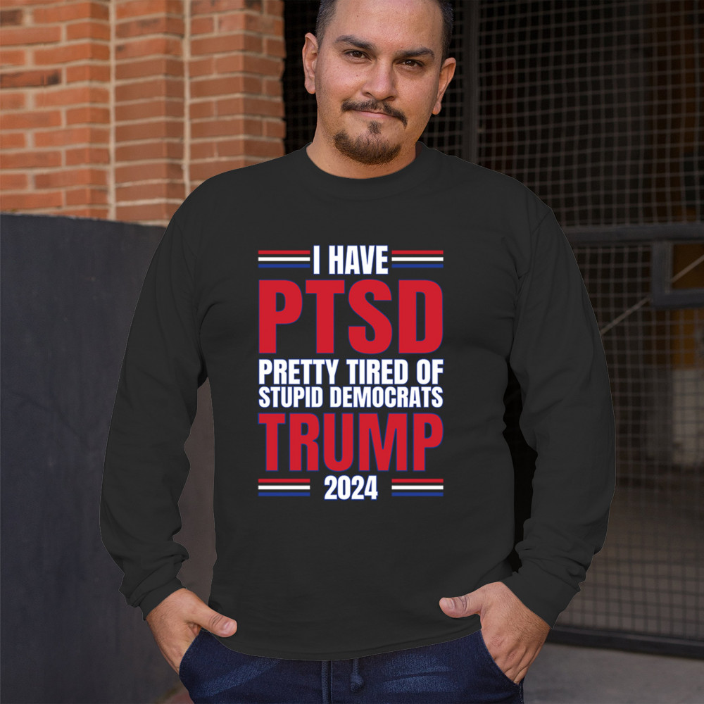 Stand up against the political chaos with "I have PTSD Pretty Tired of Democrats, Trump 2024" tee. As a dedicated supporter of conservative values, join the Trump Train to victory. Trust in God, not government, and reject the traitors to our nation. Let the American flag symbolize our resilience as we fight for President Trump and the future of America.
