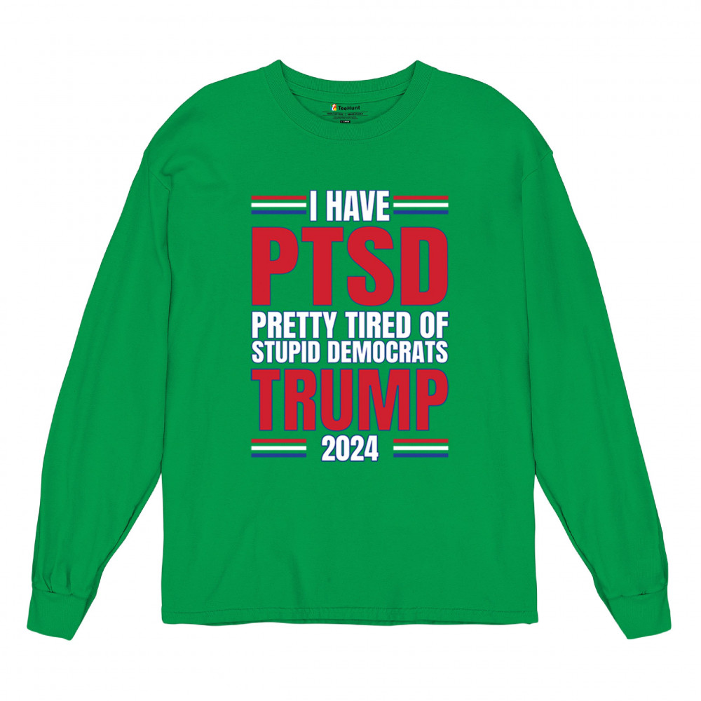 Stand up against the political chaos with "I have PTSD Pretty Tired of Democrats, Trump 2024" tee. As a dedicated supporter of conservative values, join the Trump Train to victory. Trust in God, not government, and reject the traitors to our nation. Let the American flag symbolize our resilience as we fight for President Trump and the future of America.
