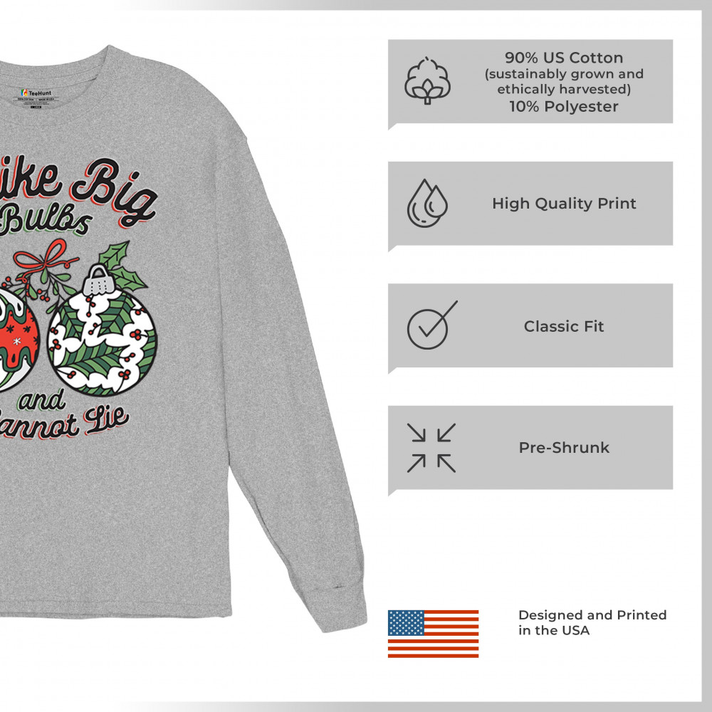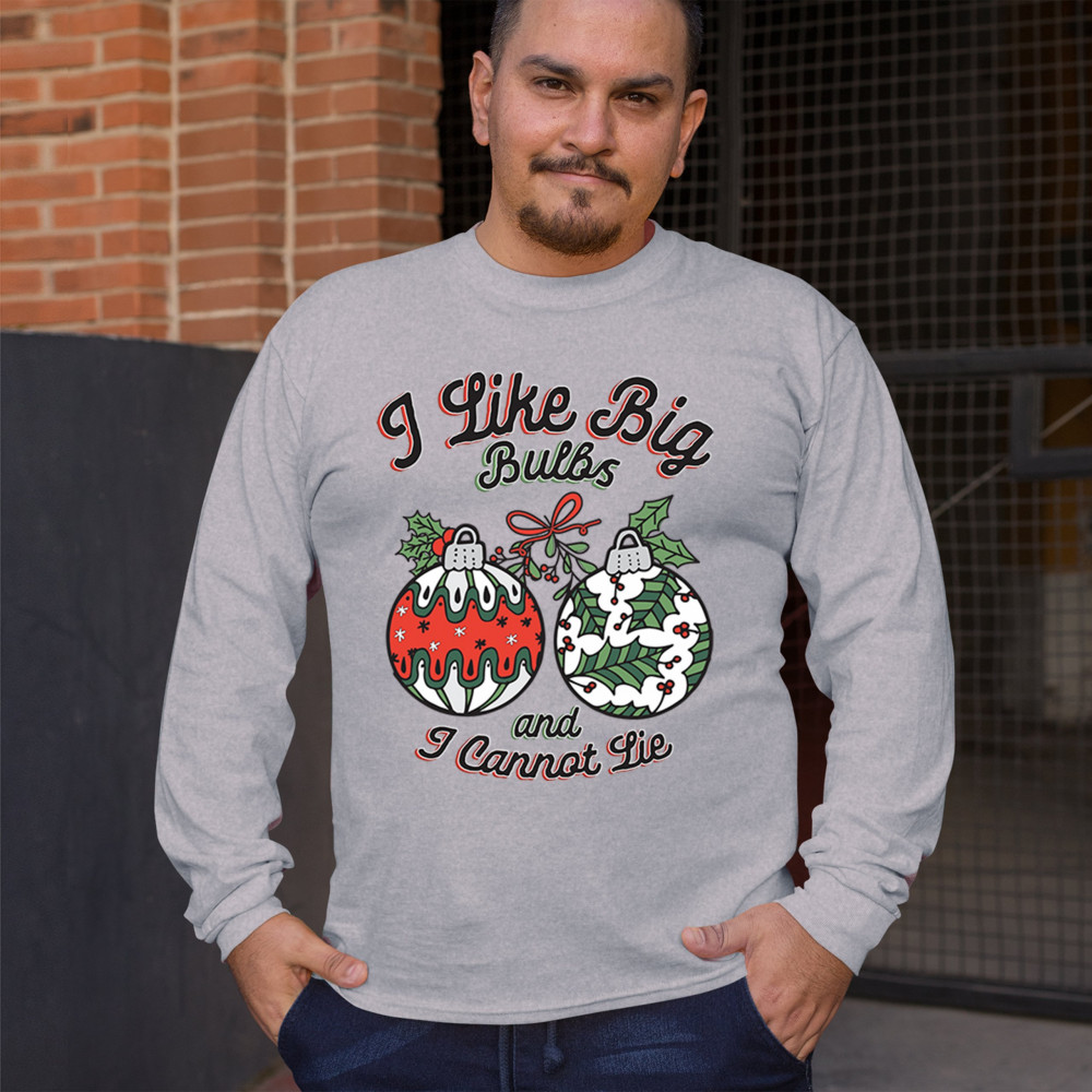 Light up the holiday season with our "I Like Big Bulbs" design, a playful and festive addition to any celebration. This unique design is perfect for cozy family gatherings, office parties, or Secret Santa exchanges, adding a humorous twist to your holiday wardrobe. Ideal for matching group outfits or gift exchanges, it captures the Christmas spirit in a fun and memorable way. From jolly gatherings to festive gift ideas, this design brings cheer to every holiday event.