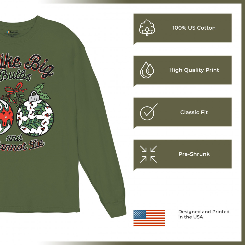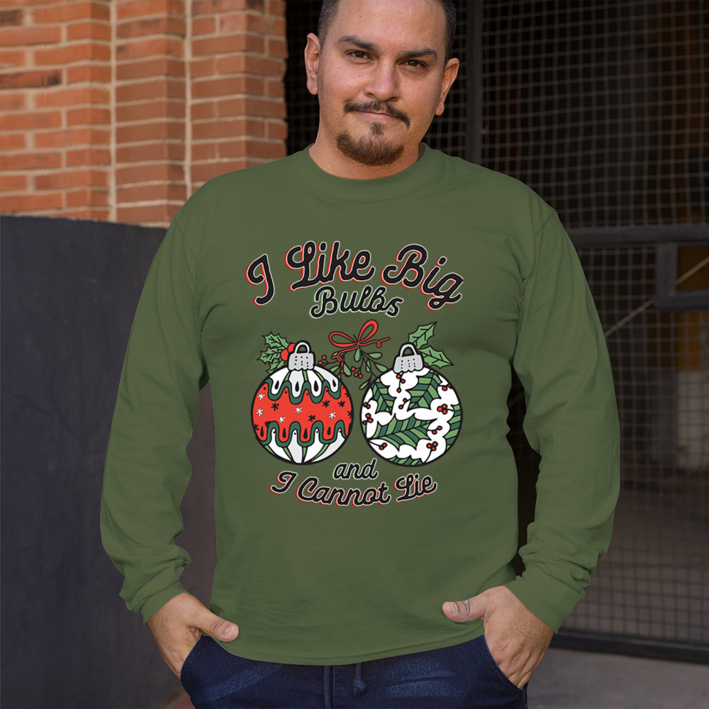 Light up the holiday season with our "I Like Big Bulbs" design, a playful and festive addition to any celebration. This unique design is perfect for cozy family gatherings, office parties, or Secret Santa exchanges, adding a humorous twist to your holiday wardrobe. Ideal for matching group outfits or gift exchanges, it captures the Christmas spirit in a fun and memorable way. From jolly gatherings to festive gift ideas, this design brings cheer to every holiday event.