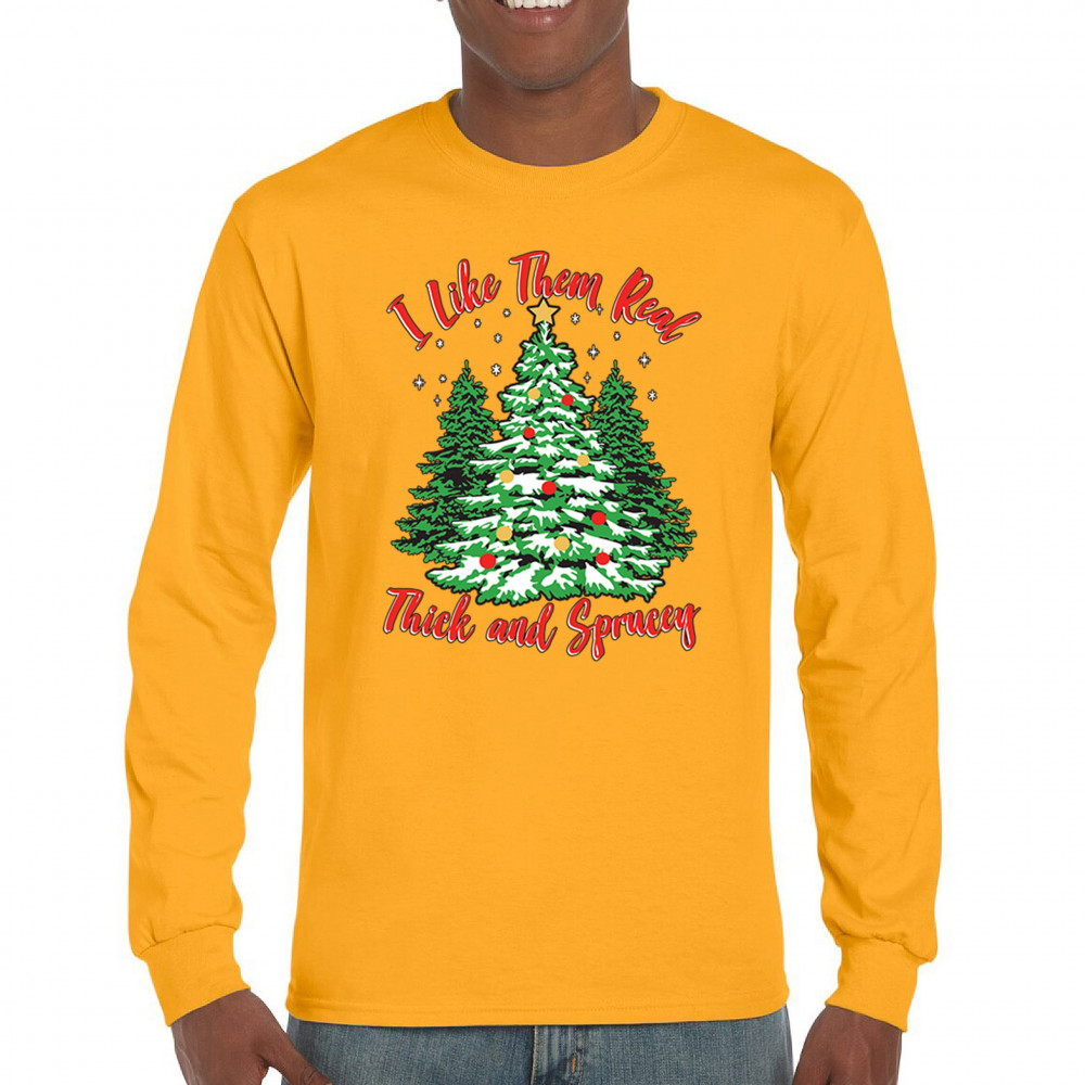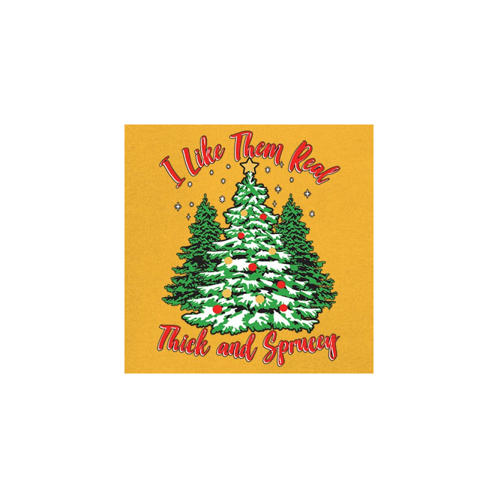 Enjoy the holiday season with our "I Like Them Real, Thick, and Sprucey" Christmas tree design, perfect for festive gatherings and holiday gifting!
