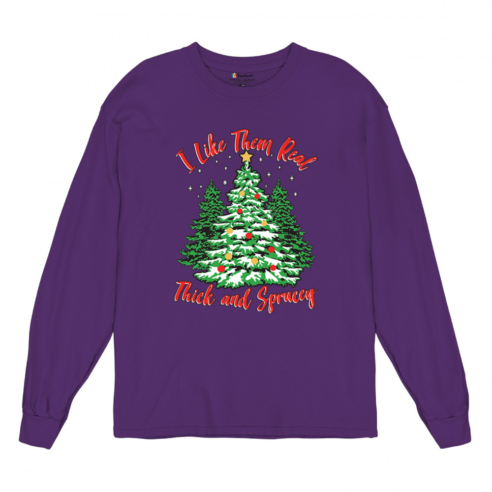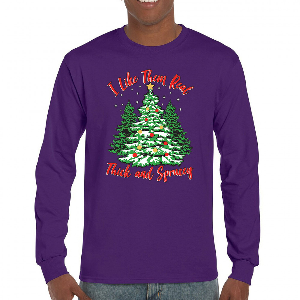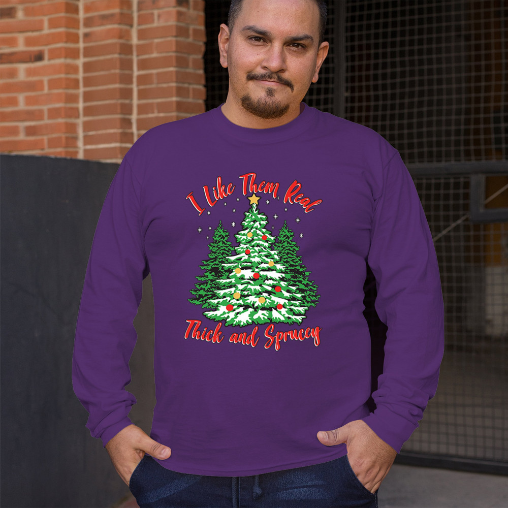 Enjoy the holiday season with our "I Like Them Real, Thick, and Sprucey" Christmas tree design, perfect for festive gatherings and holiday gifting!