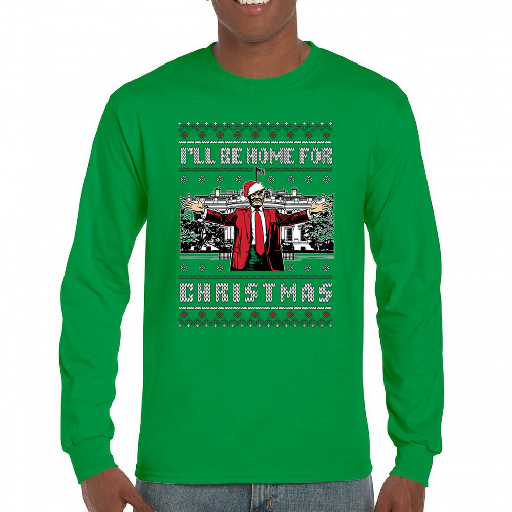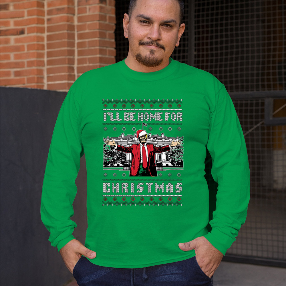 Get into the Christmas spirit with the "I'll Be Home for Christmas" design featuring Donald J. Trump in a festive holiday setting. Perfect for ugly sweater contests, holiday gatherings, and unique gifts for supporters, this humorous design adds a bold, patriotic touch to your seasonal celebrations. Whether for cozy mornings or office parties, it's a must-have for holiday cheer.