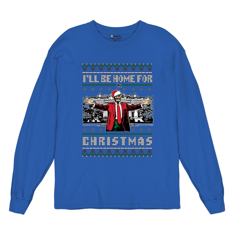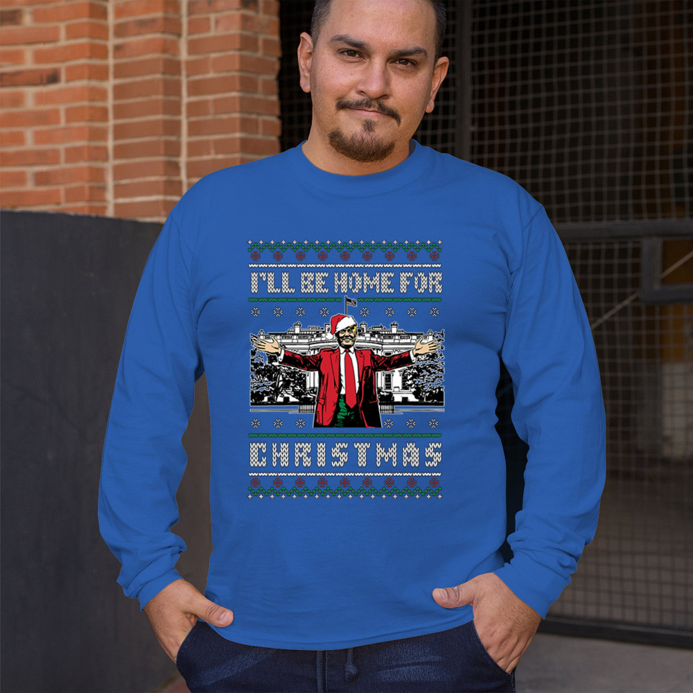 Get into the Christmas spirit with the "I'll Be Home for Christmas" design featuring Donald J. Trump in a festive holiday setting. Perfect for ugly sweater contests, holiday gatherings, and unique gifts for supporters, this humorous design adds a bold, patriotic touch to your seasonal celebrations. Whether for cozy mornings or office parties, it's a must-have for holiday cheer.