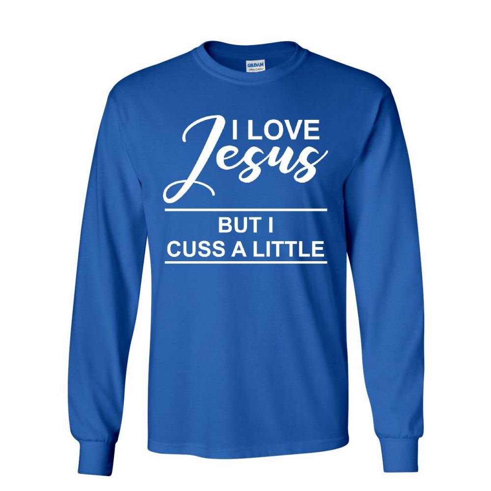 I LOVE JESUS BUT I CUSS A LITTLE long sleeve t-shirt funny religion catholic tee royal blue