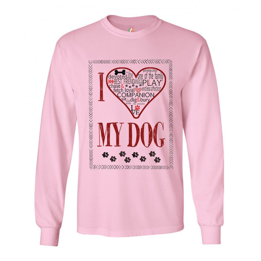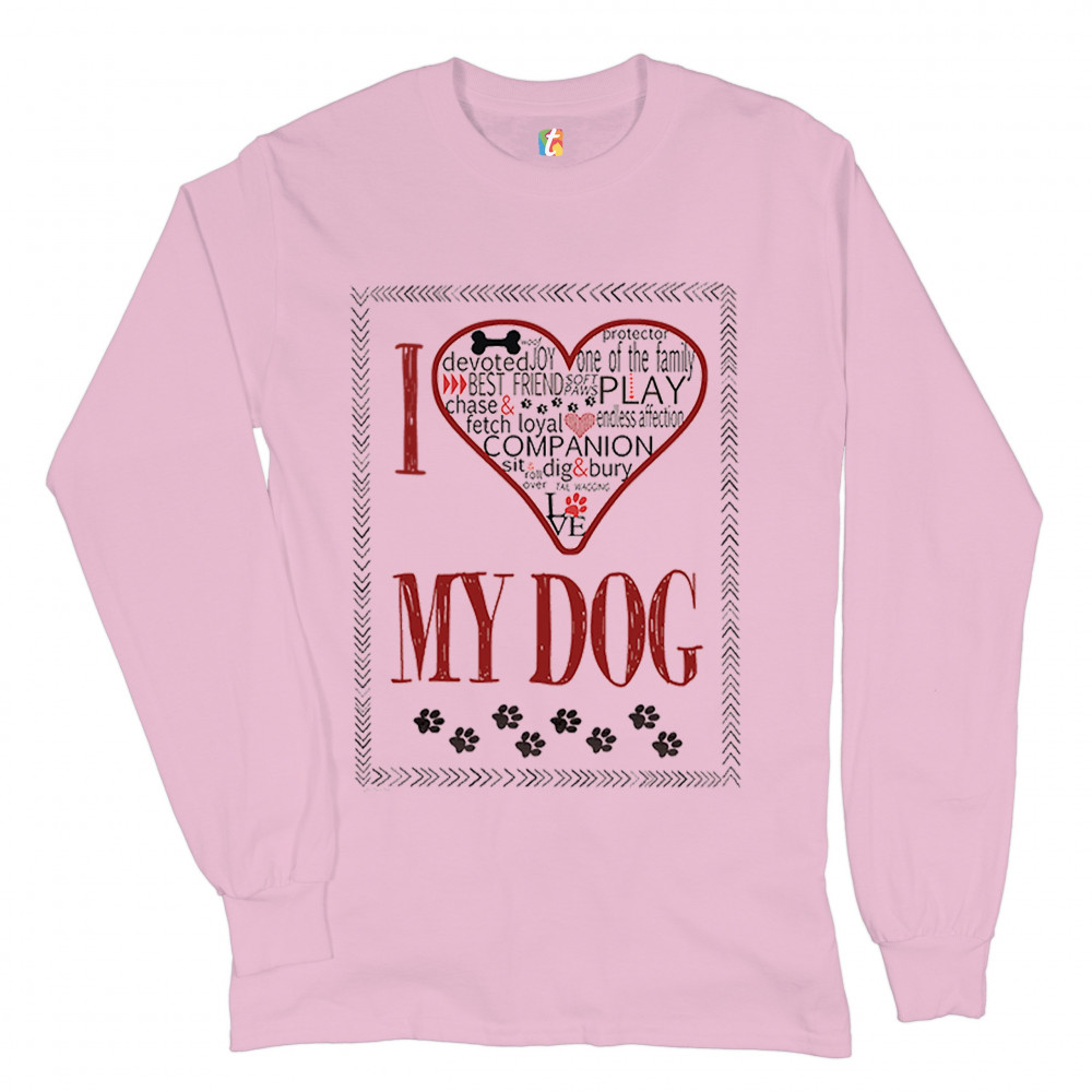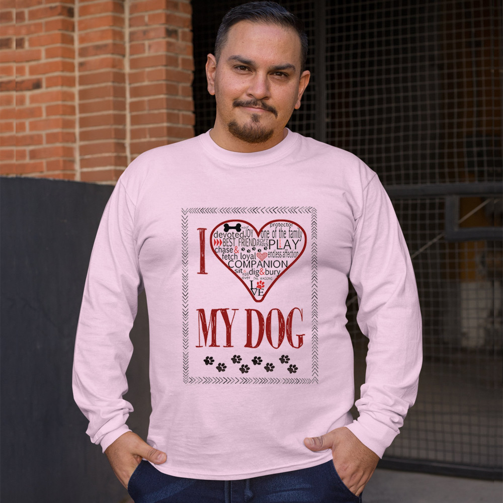 A sweet print featuring a frame inside of which, there are dog tracks and the phrase "I love my dog" in which "love" is replaced with a huge heart. The heart is filled with numerous compliments a beloved dog can be described with. A great choice for any d