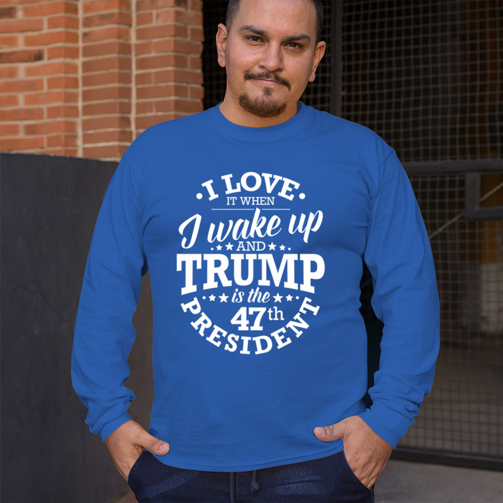 This "I Love It When I Wake Up and Trump is the 47th President" design is the ultimate expression of support for Donald J. Trump and his vision for America. Join the ranks of proud conservatives, Republicans, and America First advocates who are excited about the 47th President’s leadership. Celebrate the Red Wave and stay true to the values of freedom and strength that Trump embodies. Perfect for rallies, gatherings, and everyday patriotic wear.