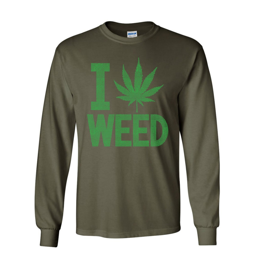 I LOVE WEED long sleeve t-shirt smoking 420 pot reggae rasta marijuana kush tee military green
