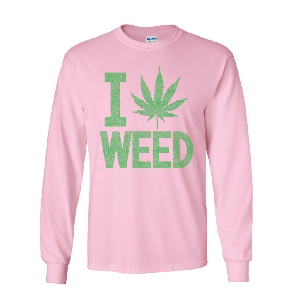 I LOVE WEED long sleeve t-shirt smoking 420 pot reggae rasta marijuana kush tee light pink